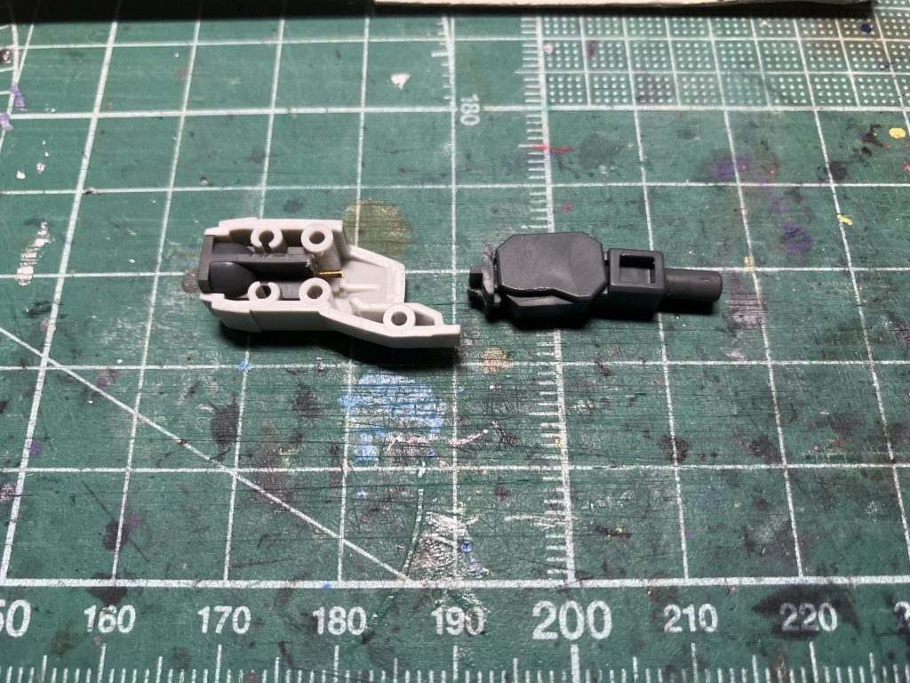 ソード/ブラストインパルスの製作を始めました。共通工作①は前腕。肘近辺で前腕フレームを分割。0.8mm真鍮線で軸打ち、側面を削いでいます。
