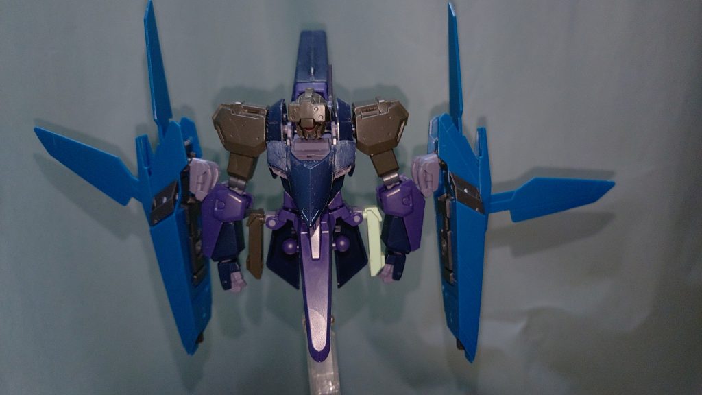 そうして現状がメインの絵の状態。MA形態で飛行機に生首が乗ってるという感じにならないためにはバイザーが付いたエコーズジェガンを使うしかないと思っていたので、肩や腰もジェガンのものに換装。ムーバブルシールドバインダーの代わりはリゼルのディフェンサー装備に付いてるビームキャノン付きのバインダーを利用。ウイングも付いてるので、変形後のフォルムも結構航空機っぽくなるかなと思い採用。