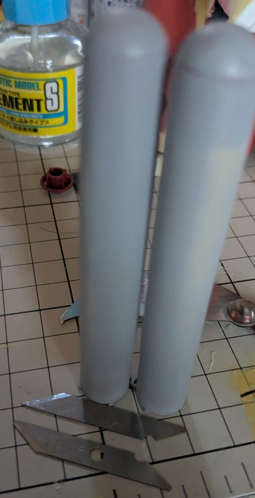 深夜0時頃まで、1ミリのプラ板を126枚細かく切り刻んで用意して、今朝職場へ出勤する前までペタペタプラ板を貼り合わせて、丸くなる様に紙ヤスリで形を作って、刃が欠けたデザインナイフで、ポリパテを盛ってある程度形にして職場へ。帰宅後。乾いたポリパテをヤスリがけして何とか形になった。リゲルグのプロペラントタンクより約6.3センチ延長しました。