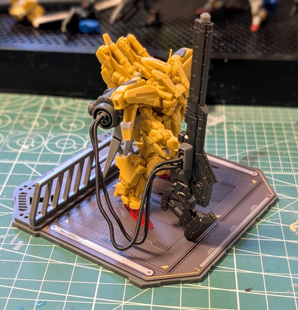 ロングメガバスターらしき物にコードを取り付けてみました!手持ちのが1本足りなくなってしまったので買いにいかねば…😇通常時のバックパックとコンパチ仕様にしてあります🫡武器も手首ごと交換することでビームライフルを持たせることができます!