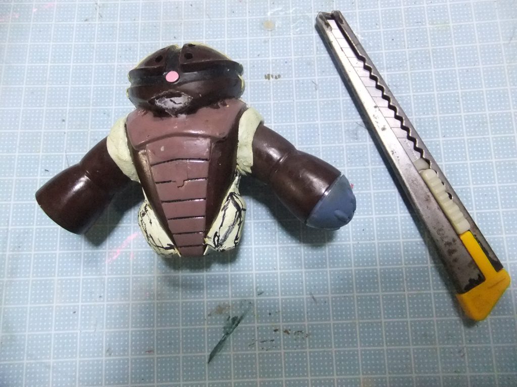 幸い 胴体の楔形の幅詰め 股関節基部のエポパテ造形( 四十年経過するとタミヤエポパテは経年劣化でココ迄変色します💦)