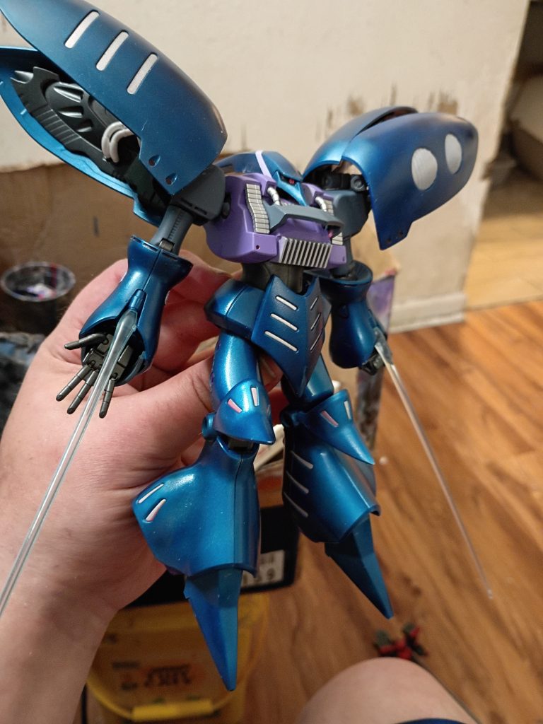 こんにちは、GUNSTAです!今回はクヴェリーのカスタムリペイントを公開します。手首のビームサーベルをMG仕様に交換しました。使用色はメタリックブルー、ラベンダー、パープル、ホワイトアルミです。キットは組み立て済みで入手したのですが、ファンネル付きの背部スカートアーマーが付属していませんでした。いつかサイコミュ用の武装を自作してみようと思っています。