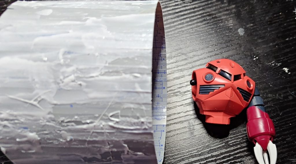 クーベルメの枠の部分を貼り終えて、隙間や凹凸を埋めるためにプラ板の切れ端を流し込み接着剤で溶かし隙間や凹凸を埋める作業をしています