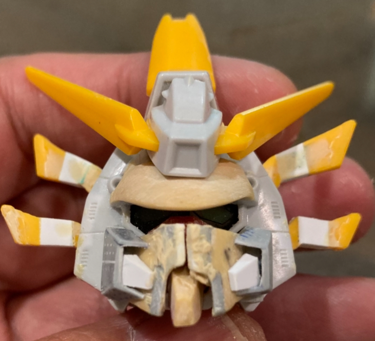 1994年6月に発売された旧キットですが、RGに先駆けること31年前に顔の完全変形を再現していました。ただマスク部分がノッペリしていてカッコ良くない(2枚目の写真)ので改造中です。顔の横のツノも大型化しています。