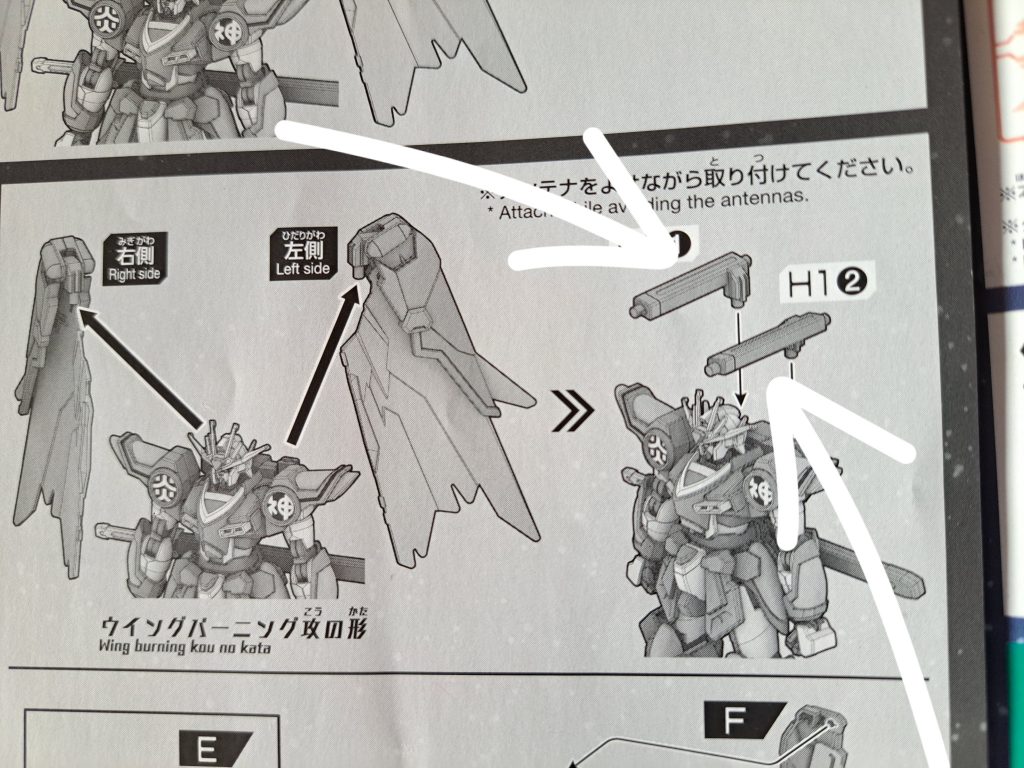 神バーニングのウイングバーニング威の形をどうにかしたかったので、サムネの矢印のパーツをちょっと加工しました。ピンバイスとカッターがあればできます。