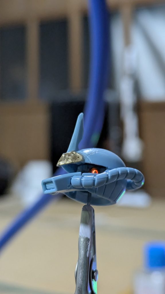 中のモノアイパーツを完全に剥ぎ取り、100均のビーズと針金で、奥の方から目が光ってるような表現をしてみました。モノアイはよく見ると六角形になるようにして機械感を出しつつも、真ん中を光らないようにして瞳孔が閉じているようなイメージに仕上げました👁