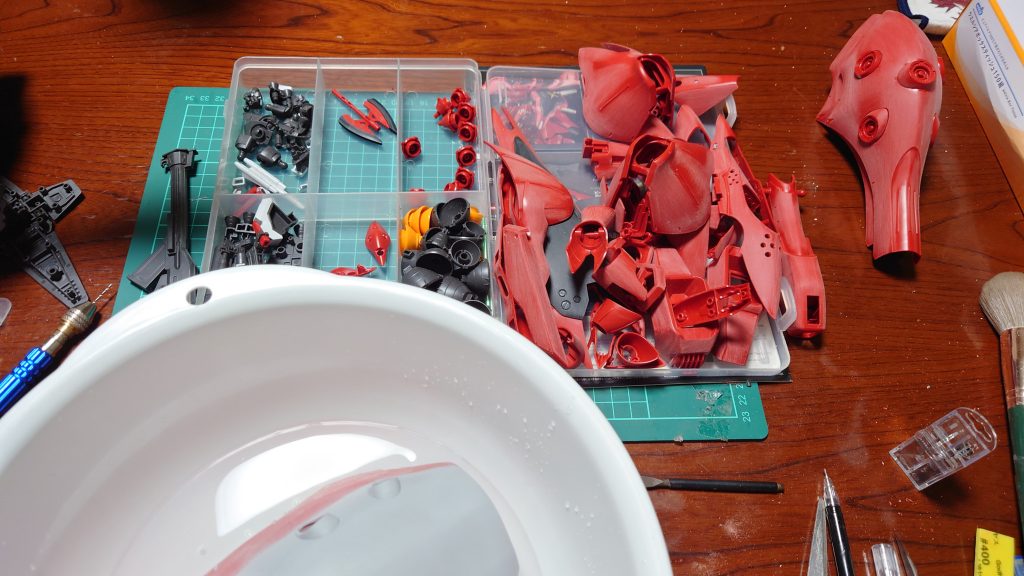 次に装甲パーツを120番の神ヤスで荒削り、でかいパーツは水研ぎで熱を持たせないように…