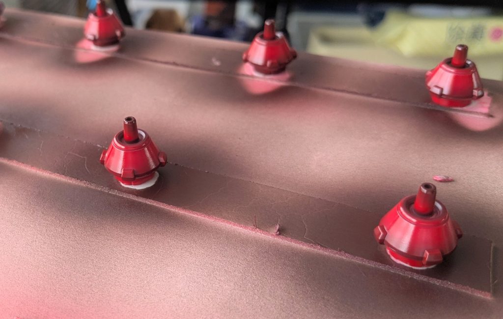 GXクリアルージュ2本を3倍希釈、エア圧は0.15ぐらい…圧はもうちょい下げたほうが塗料が減らなくて良いのかもしれないけど、大きなパーツに遠くから吹くにはこのぐらいの圧があったほうが良いだろうし、、難しい😅