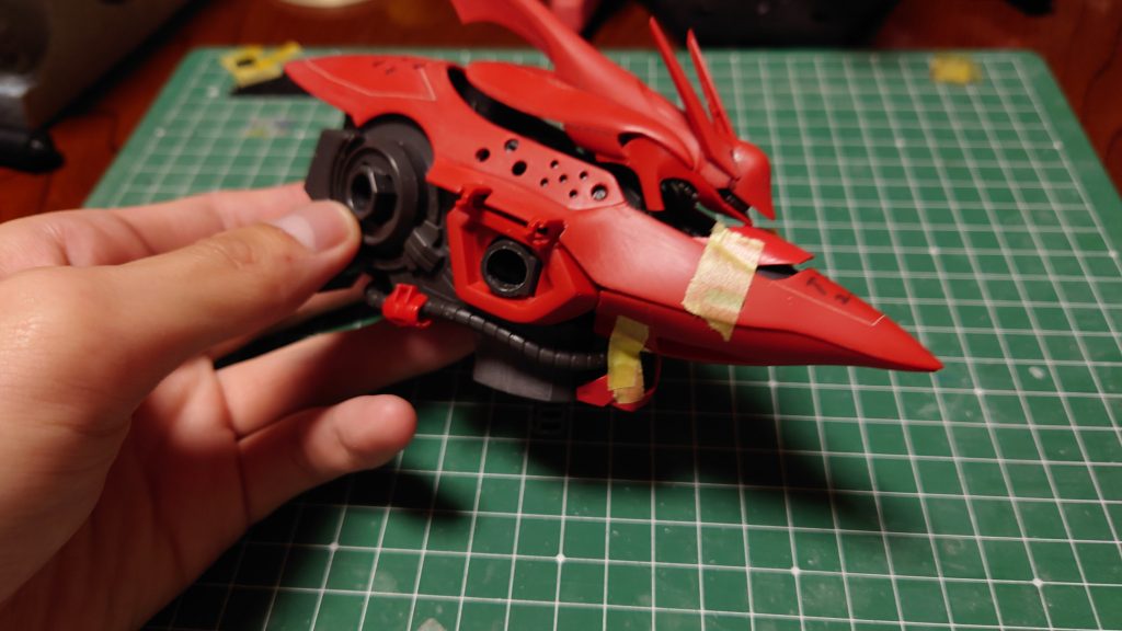 そしてシールド。これはνのHWSを参考にRGサザビーのシールドを上からペタリ。ナイチンゲールのシールドの元々ミサイルがあったところにサザビーのビームショットライフルをペタリ。そしてサザビーのシールド側にHGフルコーンのガトリングをペタリ。ただのシールドが前後攻撃できる超攻撃性能を装備したクソ強シールドに!!!!