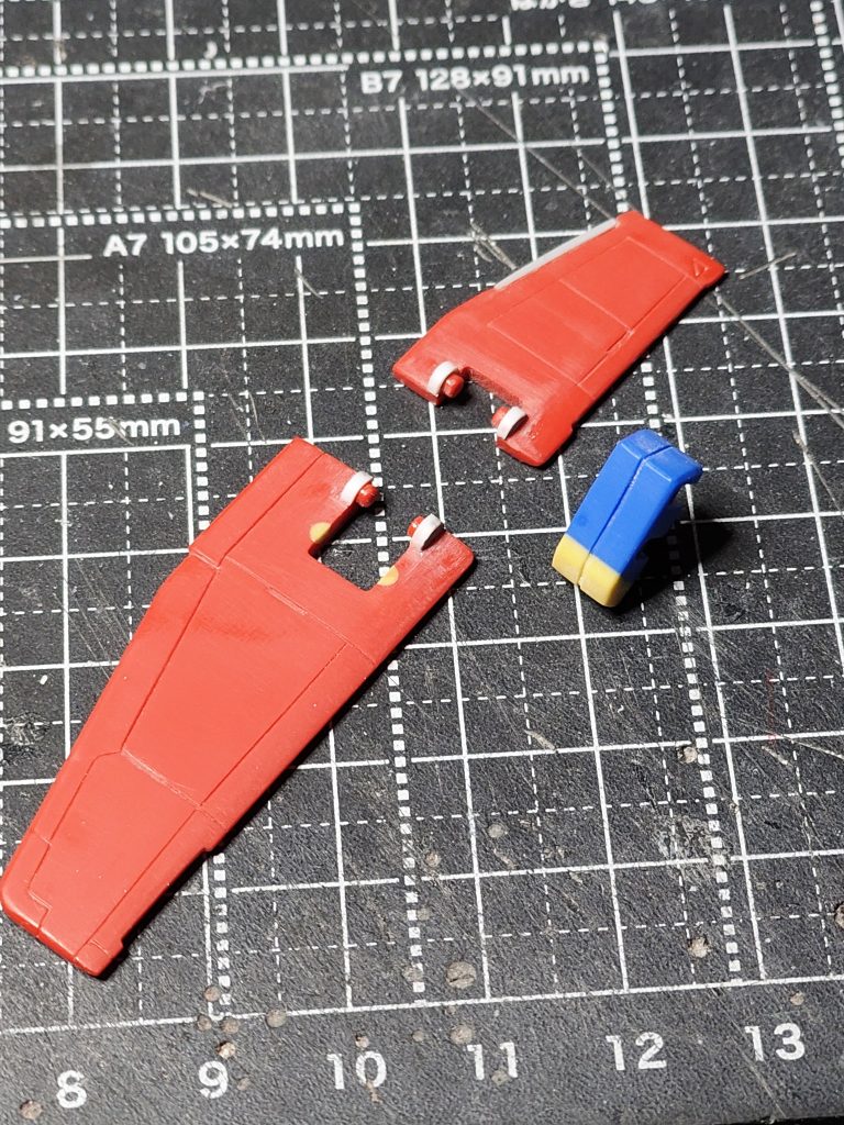 ・大きいウイングと青のジョイントパーツの隙間がありすぎるので、ジョイントパーツをエポパテで増幅。モールドも追加。
