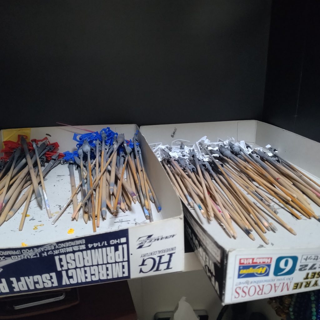 塗装はちょい中止したのですが、取り敢えずありったけの塗装持ち手を付けて準備だけはしました!😄今回は同時進行してる補修塗装とスジ彫りもあるので!少しでも進めておかないと行けないので!😄見たい方はコメントして下さい!ちなみに補修は前に投稿したPGザクショルダーアーマースジ彫り再塗装、MGゲルググスカート全体デカール張り替え、量産ズゴック両腕両足デカール張り替え再塗装ですが製作ストーリーには載せないので!かなり前に書いたことがあるのですが!私は目が悪くたまぁ〜に視力が低下してたりするのですが!作りたい意欲が抑えられなくて続行してミスってる時があったりと悪い癖があったりするんです!プラモデル作る同世代の方なら分かる人もいるのでは?ここまで来たらやっちゃえ〜見たいな!😄