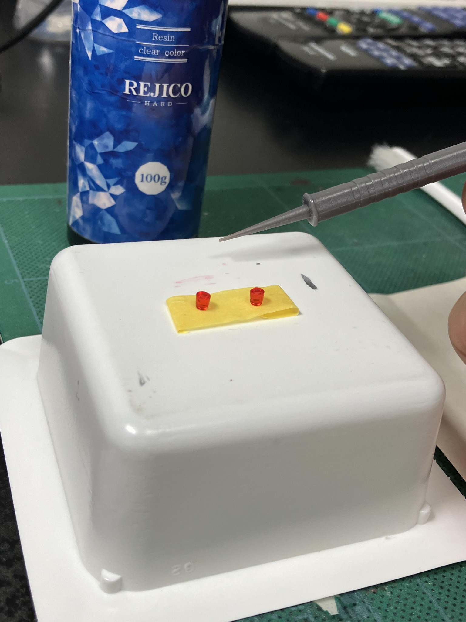 STEP2:接続部は透けるので基部の凸部を切り飛ばして平らに、クリアーパーツの凹部はレジン液で穴埋めて透過率🆙 何かと便利な豆腐バックと100均スティック👍 本来ですと回転灯でも仕込むんでしょうが無理サイズですね😆 📷3/6、📷4/6