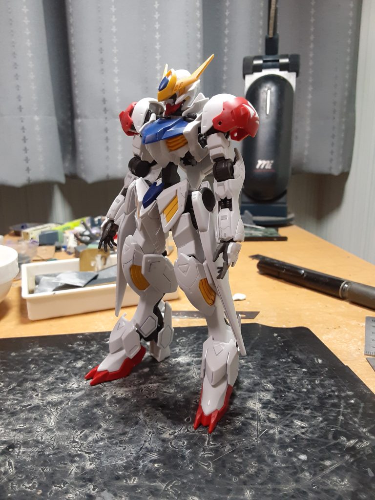 元々長いガンダムフレームの手足が追加パーツで更に長くなったバルバトスルプス。さすがに長過ぎるので足首のボールジョイントで1.7mmほど詰めて背骨を4mmも延長。
