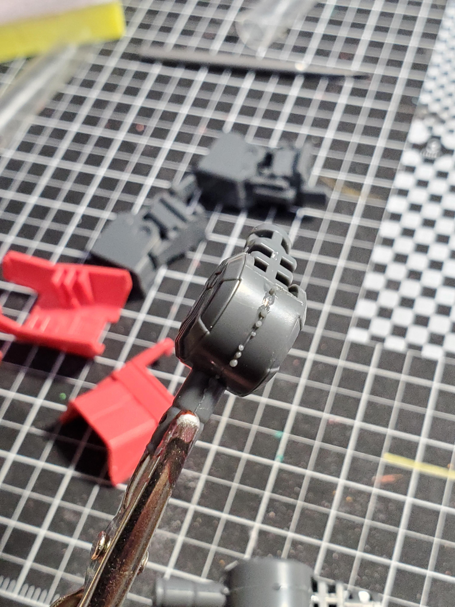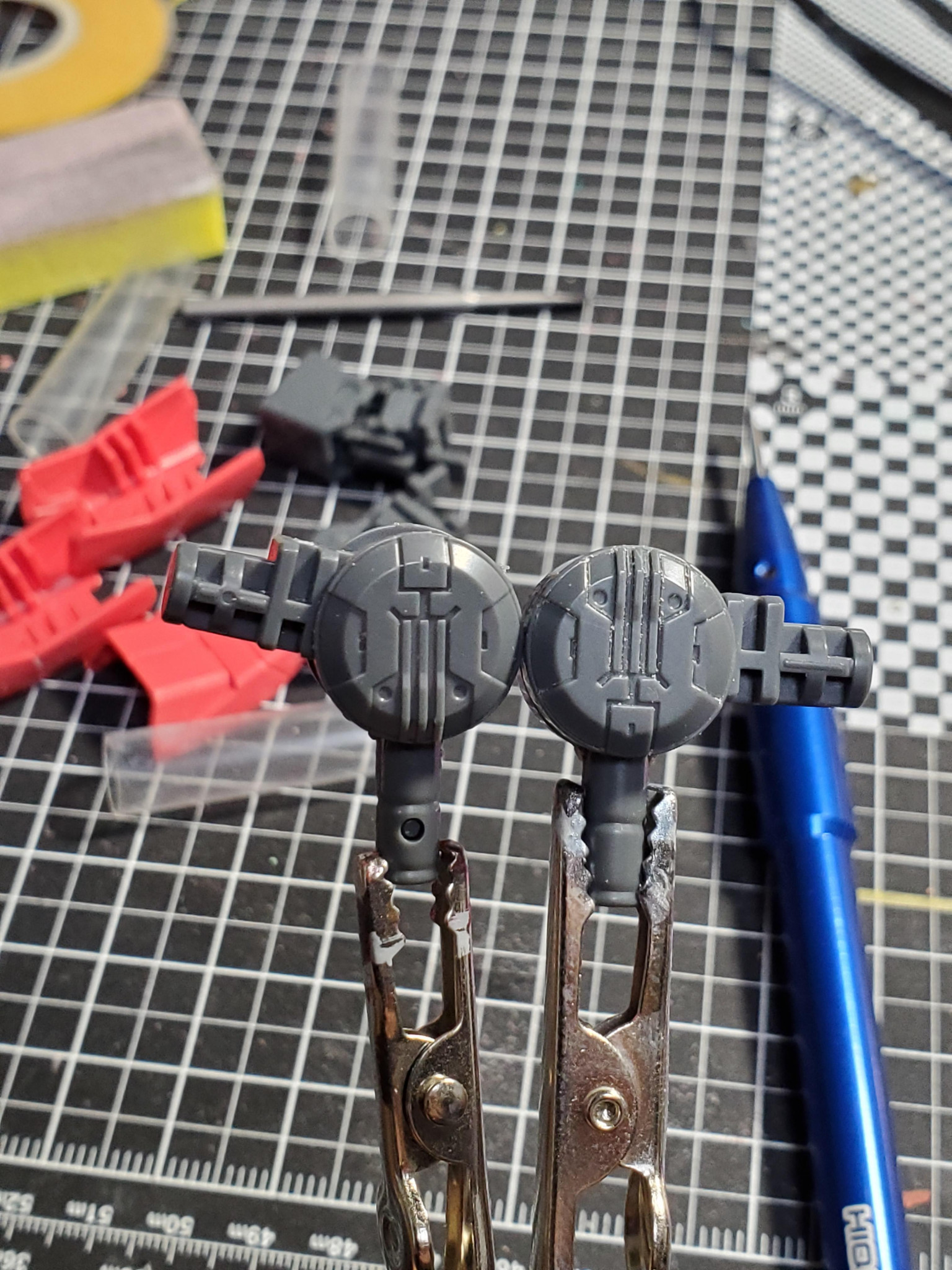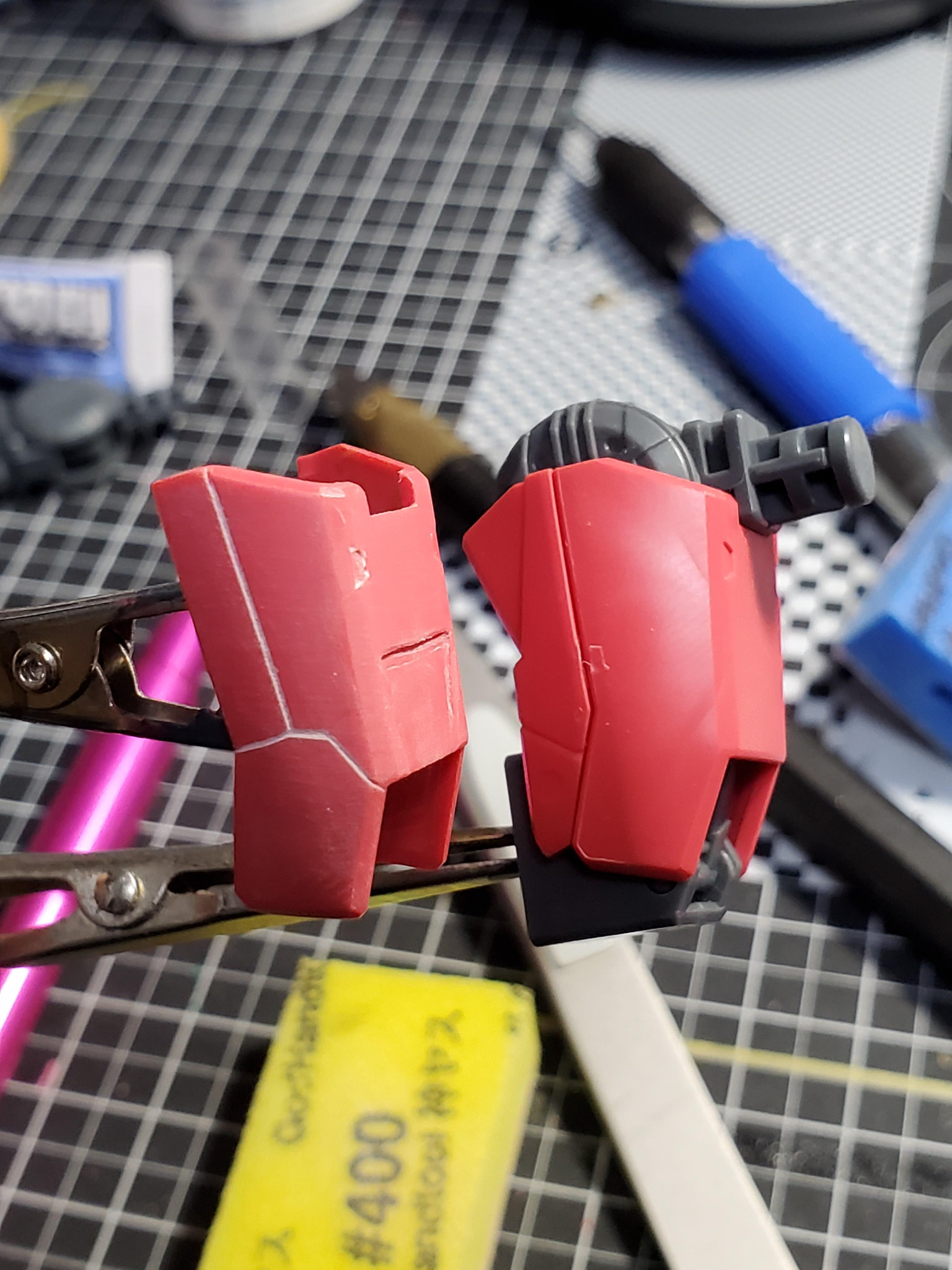 mesomeso 2025.09/29更新 MGイージス その2 8 7 いいねしたモデラー(7) 0 作品を共有 いつもは武装→足→腰胸頭→腕→バックパックの順ですが、腕から行ってみます。 肩部分は大きいデカールあるので、説明書見ながら貼り位置避けながら……ディテール追加。 ももの部分は(腕ですが、MA足の機構)パーツ追加する凹みも追加 丸くてぬるいモールドは、瞬間接着材で埋めました。ロックタイトのピンポインターゼリー状、おすすめです。 間接部の合わせ目消したのですが……接着した後、パーツがちぐはぐに組まれていることに気づきました。 左右で上下が違う……ここ結構見えるところ…… どう修正するか…… 制作中 コメント コメントをして応援しよう コメントにはログインが必要です mesomeso ガンプラ初心者 記録用 7 MGSD ガンダムエアリアル MGSD ガンダムエアリアルを作成しました。 9 RE/100 ヤクト・ドーガ(ギュネイ・ガス機) 1/100ヤクト・ドーガを筆塗全塗装作成しました。 6 MG ボール ver.ka MGボールver.kaを制作しました。 はじめてのver.k… 8 MGシャア専用ザクII 一番くじソリッドクリア 上司のご自宅に数年眠っていたシャアザクを譲っていただき、作成… mesomesoさんのページ