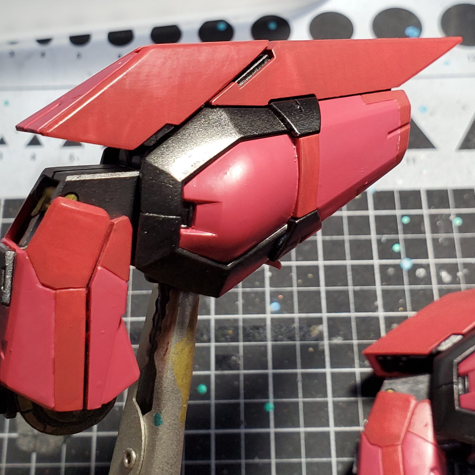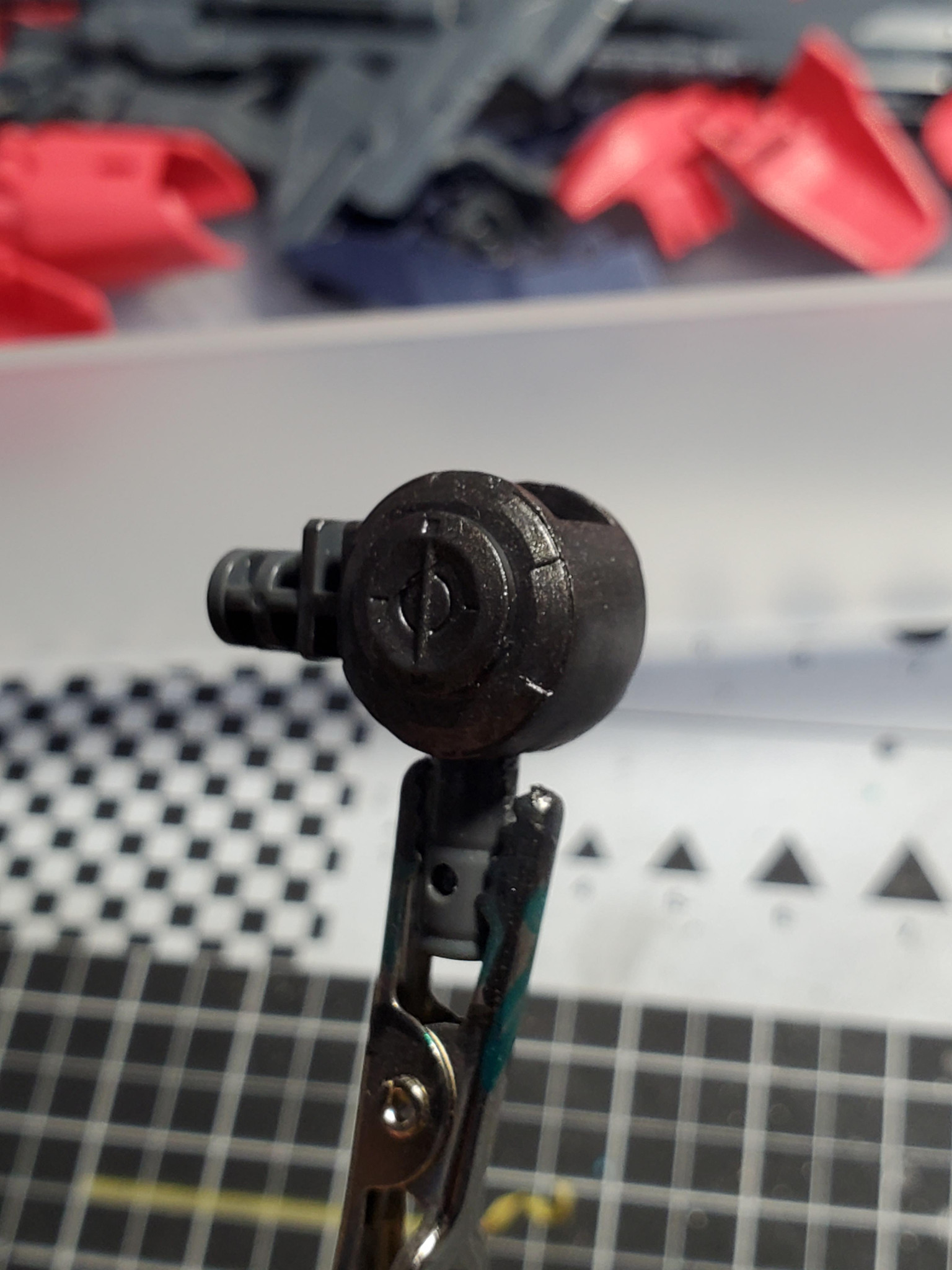 前回合わせ目消しで接着してからパーツつけ間違えに気づいた間接部は、モールドを削り落として、カスタマイズマテリアルを貼り付けました。