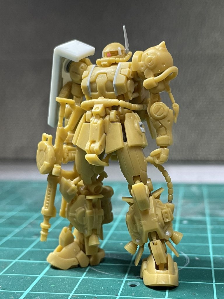 見てのとおり、プラ材の追加はアンテナ、シールド、頭、胸、サイドアーマーの一部、脚部バーニアに後ハメ加工でプラ棒を使ったのみです。社外パーツとしては太もも軸にジョイントを。