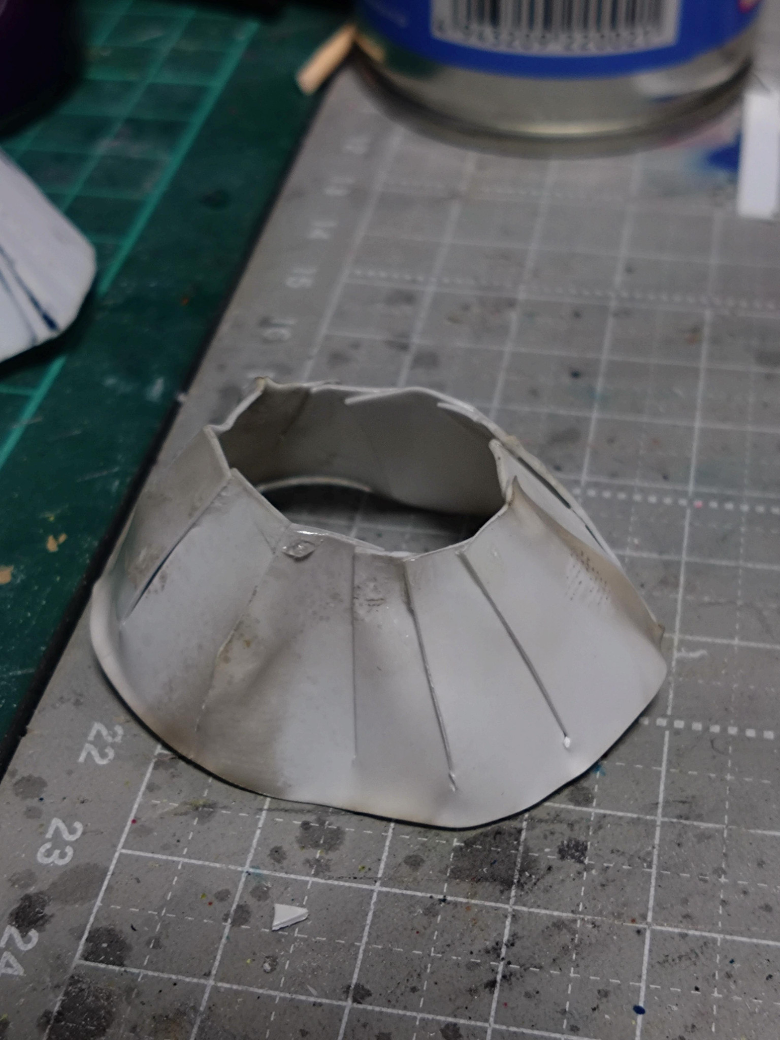 今日は昨日制作したスカートより少し短くしたプラ板をスカート一周以上の長方形型に切り取りライターで炙っては少し曲げ、そしてハサミで上から下に向かって細い3角状に切れ目を入れてその分を無理矢理曲げて瞬間接着剤とスプレーで硬化。