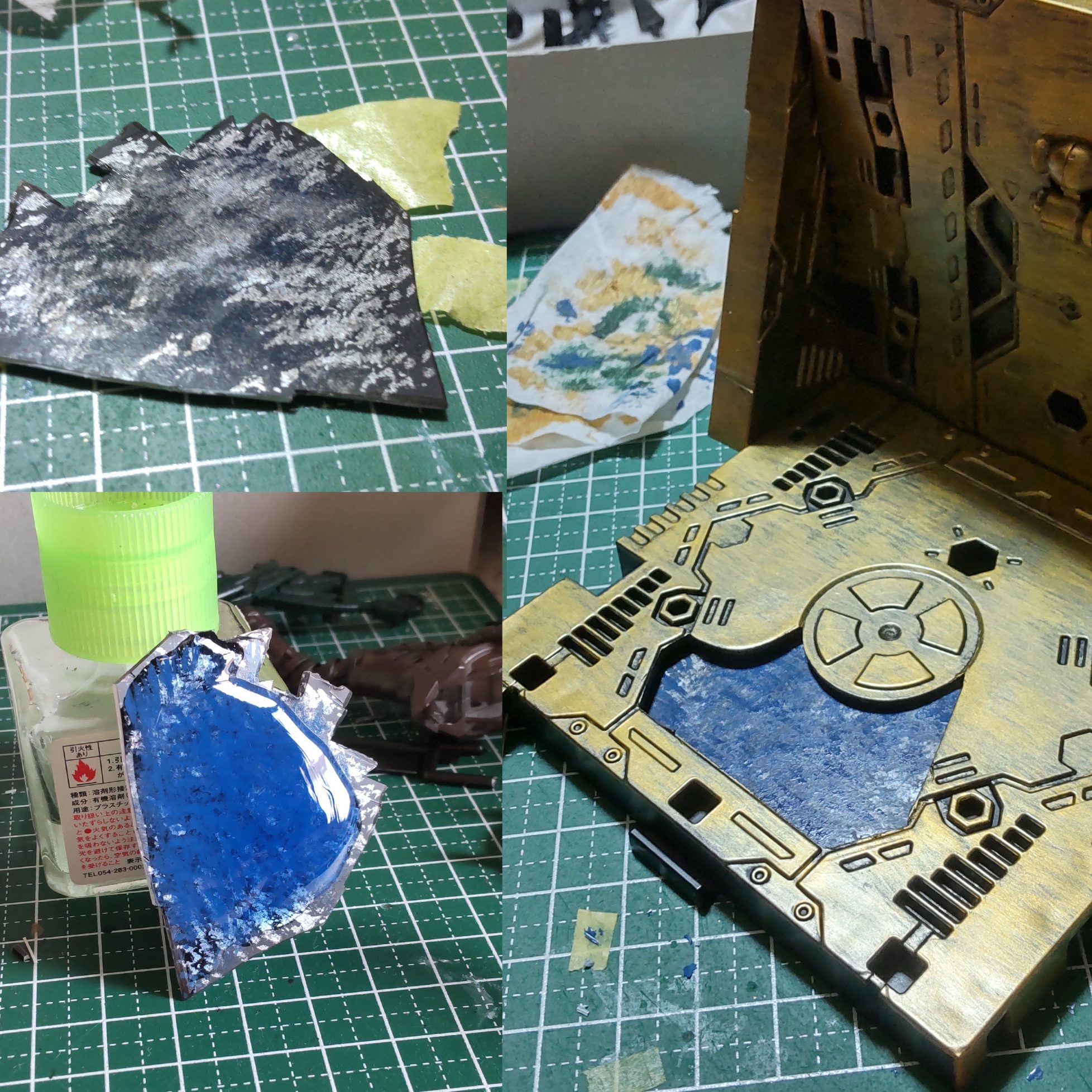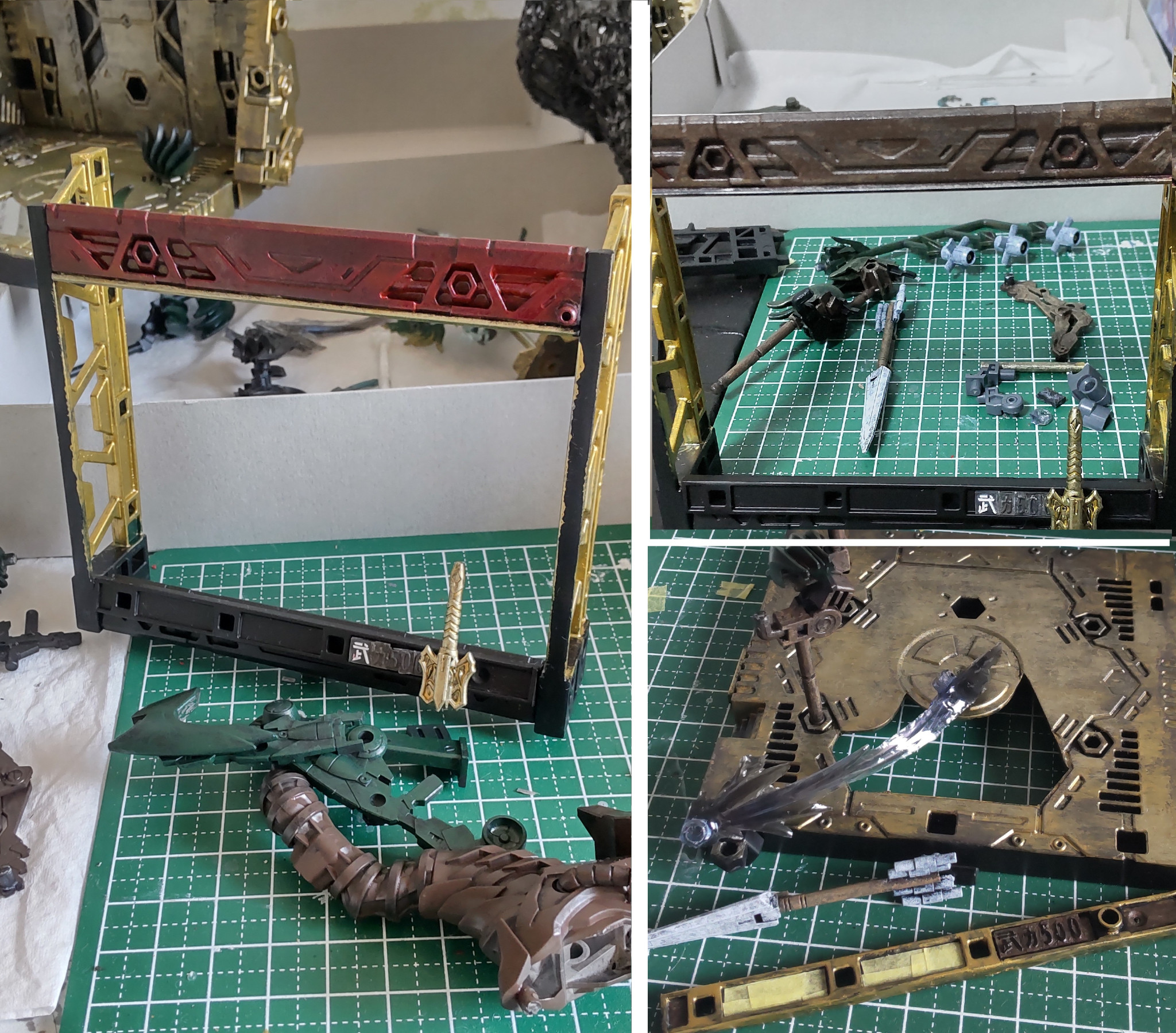 ベースの金色も同様に黒サフにファインゴールドを筆で横塗り、ゼウスシルエットゴールドを部分的にドライブラシ、焼鉄色をドライブラシでくすんだ汚れを入れ、最後にゼウスゴールドをパウダーつけるようにドライブラシで表現。