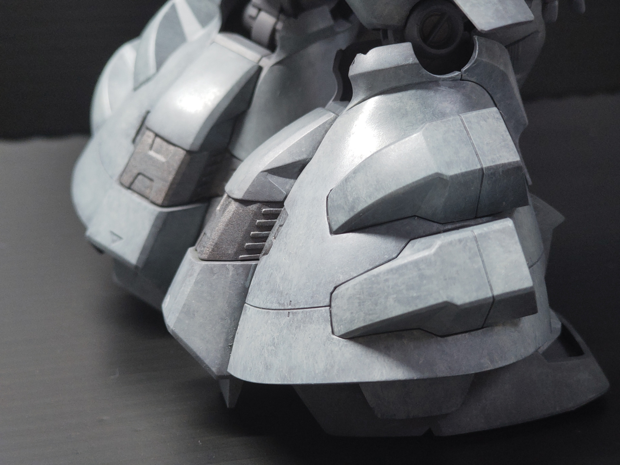 グレーの部位、1色目RLM65ライトブルー > 2色目ガルグレー、それぞれ何周か気の済むまで塗って基本塗装終わったところ。写真だとアップになってこれぐらい明暗ついていますが、肉眼で見るとこんなに下地透けてるなってわかりません汗