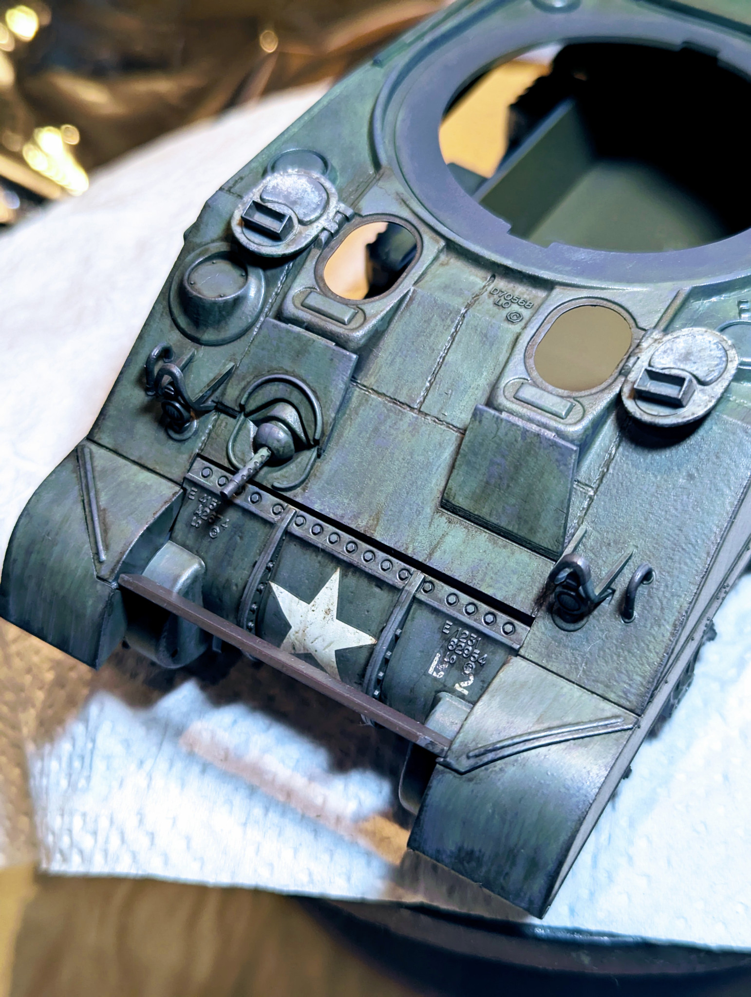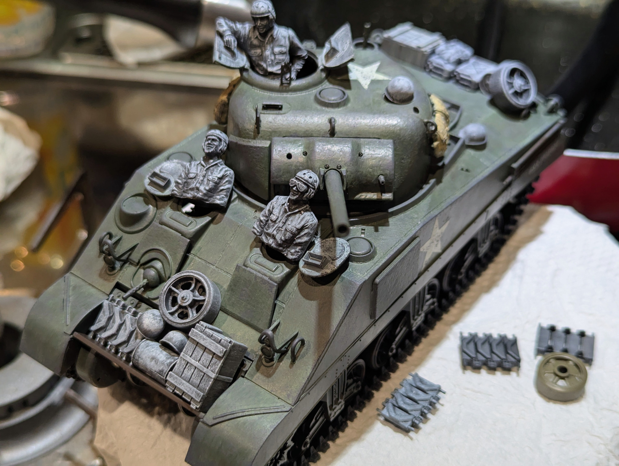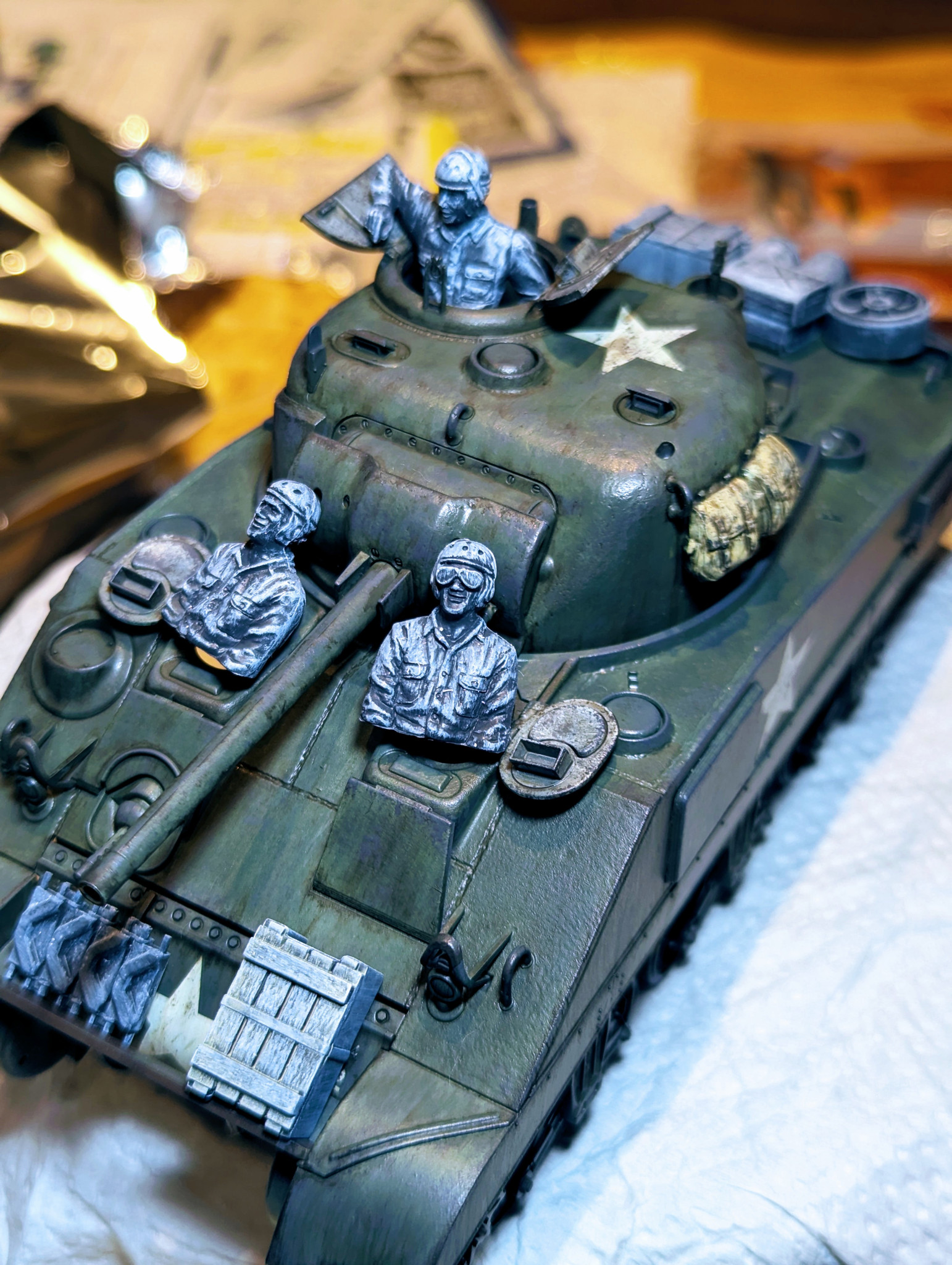 ウォッシングまで進んだシャーマンとアクセサリー達。だんだん賑やかになってきました😸荷物モリモリと臭そうな男達が織りなす情景が、戦車模型の醍醐味かなと思います✨