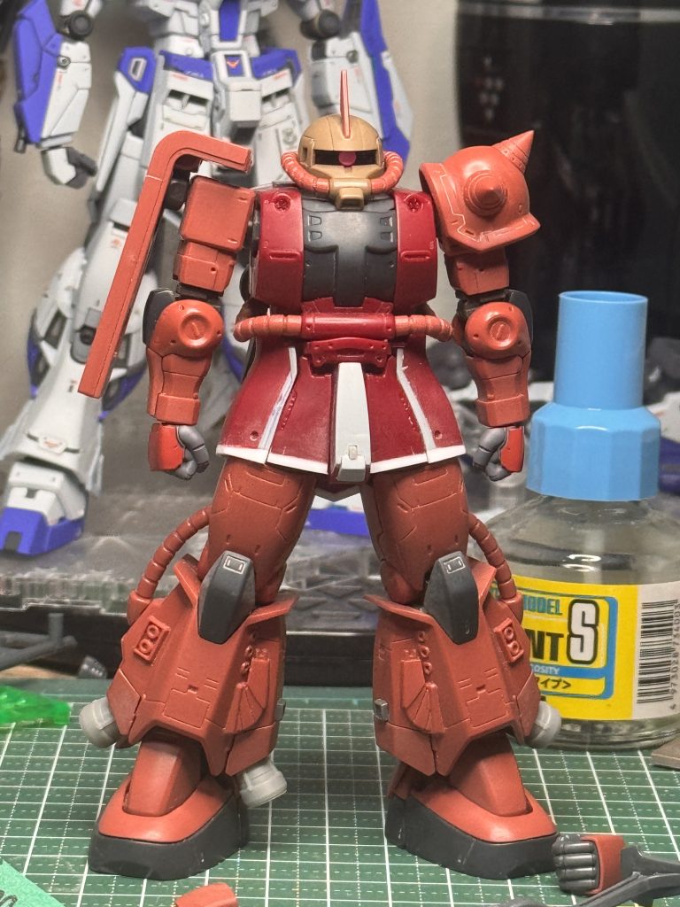 オリジン版シャア専用ザクⅡは以前素組み全塗装で製作したのでその時に気に入らなかった点を挙げて、色々なモデラーさんの改修例を参考にしながら自分なりの解釈を落とし込んで製作しています。