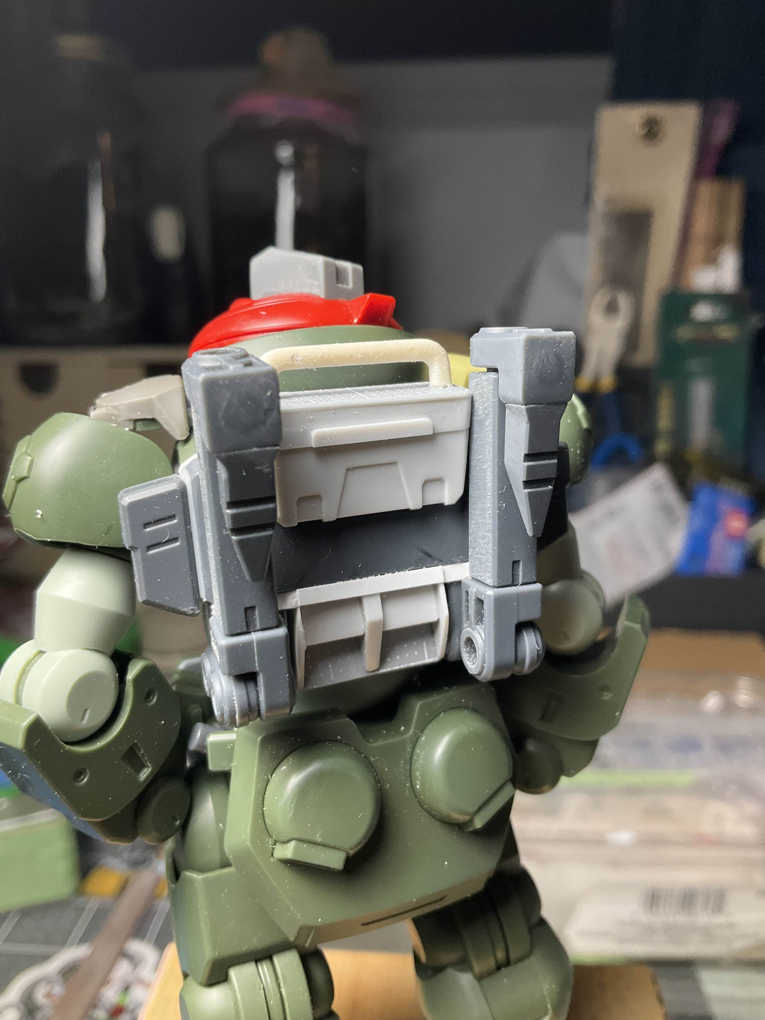 The backpack is made from a lot of different parts including the Balden Arms set and the Battle Arm Arms set. The underside of the foot is plaplates and scribing.