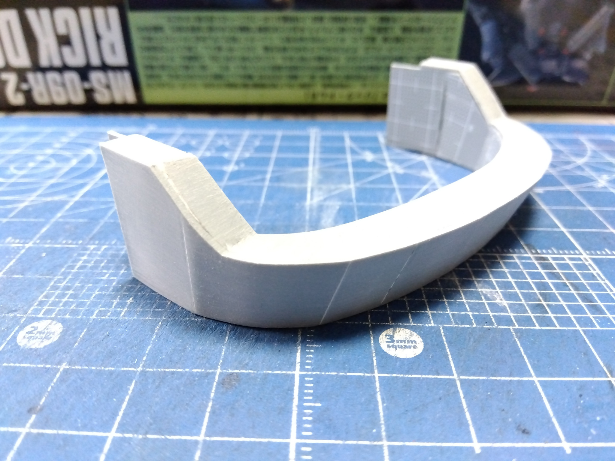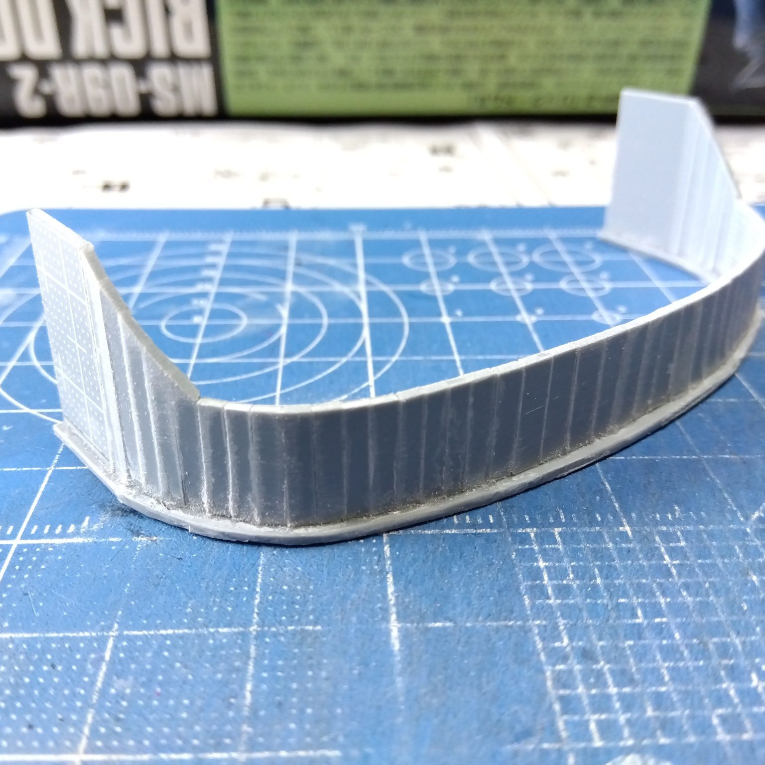 作りたい曲面の型をとって、上辺と下辺を作って、そこに細切りにしたプラ板貼り付けて(カーブの緩やかさで幅を変える)、最後に削って表面を整えればあら不思議!って感じですw