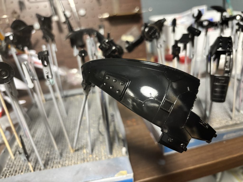 EXブラック吹き終わりました。埃やキズがありますが、いいことにします。悩みましたがプリズムブルーブラックで黒→青に偏光するような感じで仕上げることにしました。