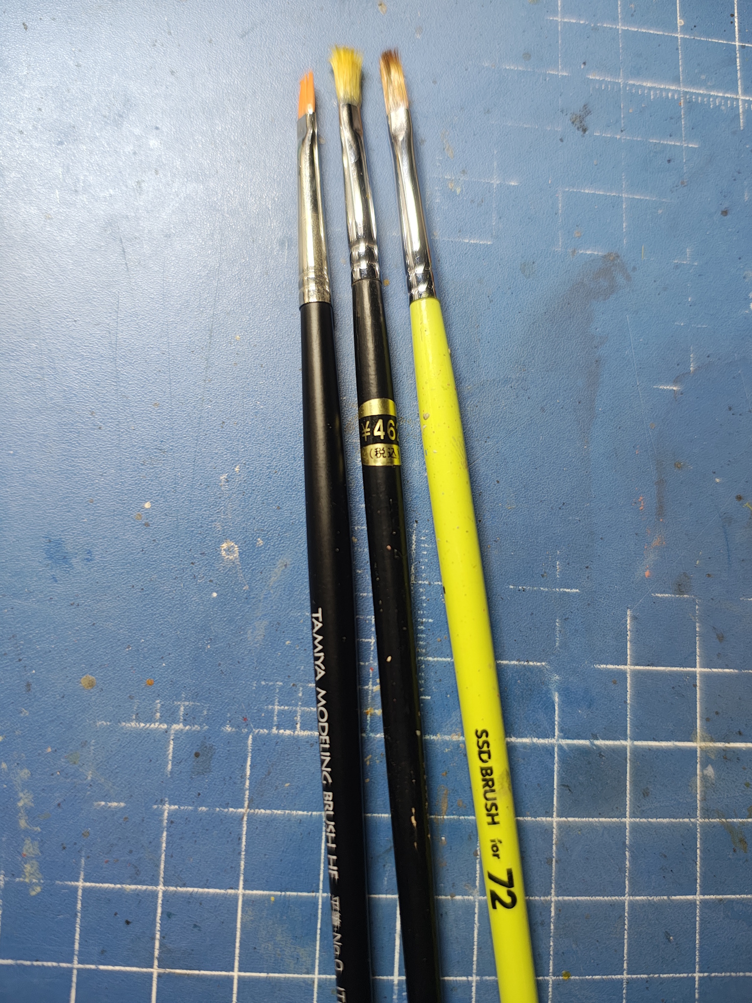 3枚目: 左からタミヤの黒軸安い方、上野文盛堂ハイセーブル、モデルカステンSSDブラシ