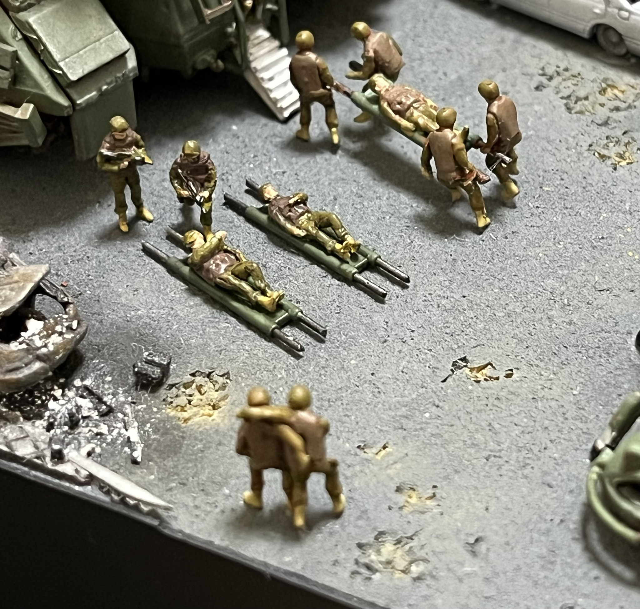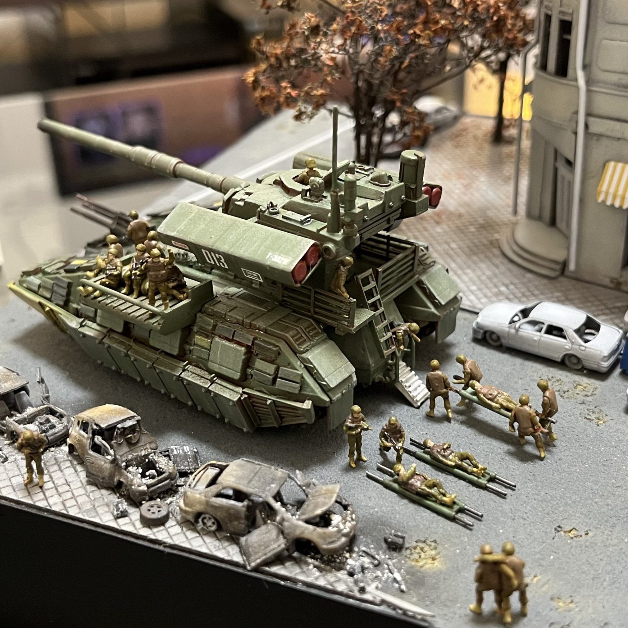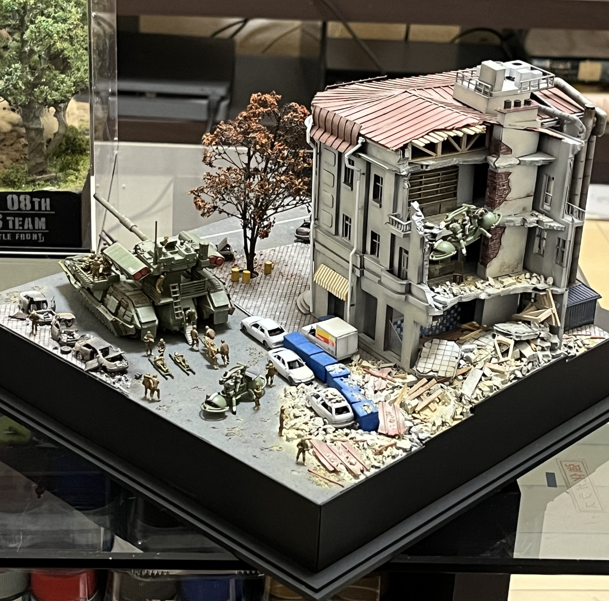 負傷兵フィギュアを追加しました。UMRCのオニー・カスガはいませんが😅よろしければ画面をタップし拡大してご覧に下さい。劇中では死傷者の描写が多くて戦争映画を観ている感じでした。あの悲壮感をガンプラで戦場ジオラマとしてしかも1/144のミニスケールで表現できてたら申し分ないと思ってます。マゼラアタックもウェザリングに手を加えました。雨垂れに埃が付着した感じで全体的に汚してます。アスファルトも少し気に入らなかったので表面をけがいてダメージを加えています。あと心残りとなっているのが建物のウクライナ語の看板です。ロケハン建物写真の正面エントランス上とオーニングテント上に取り付けられている物です(テント上のアルファベットは全く読み取れません😅)。何度となく挑戦してますがアルファベットをうまく切り抜けず挫折を繰り返してます。ミリタリースケールのジオラマだと建物の看板とか結構リアリティ出せる要素だったりするんですけど、デザインカッターで切り抜くにも1/44のサイズは小さ過ぎます😭まだ時間ありますから引き続き頑張ろうと思います。