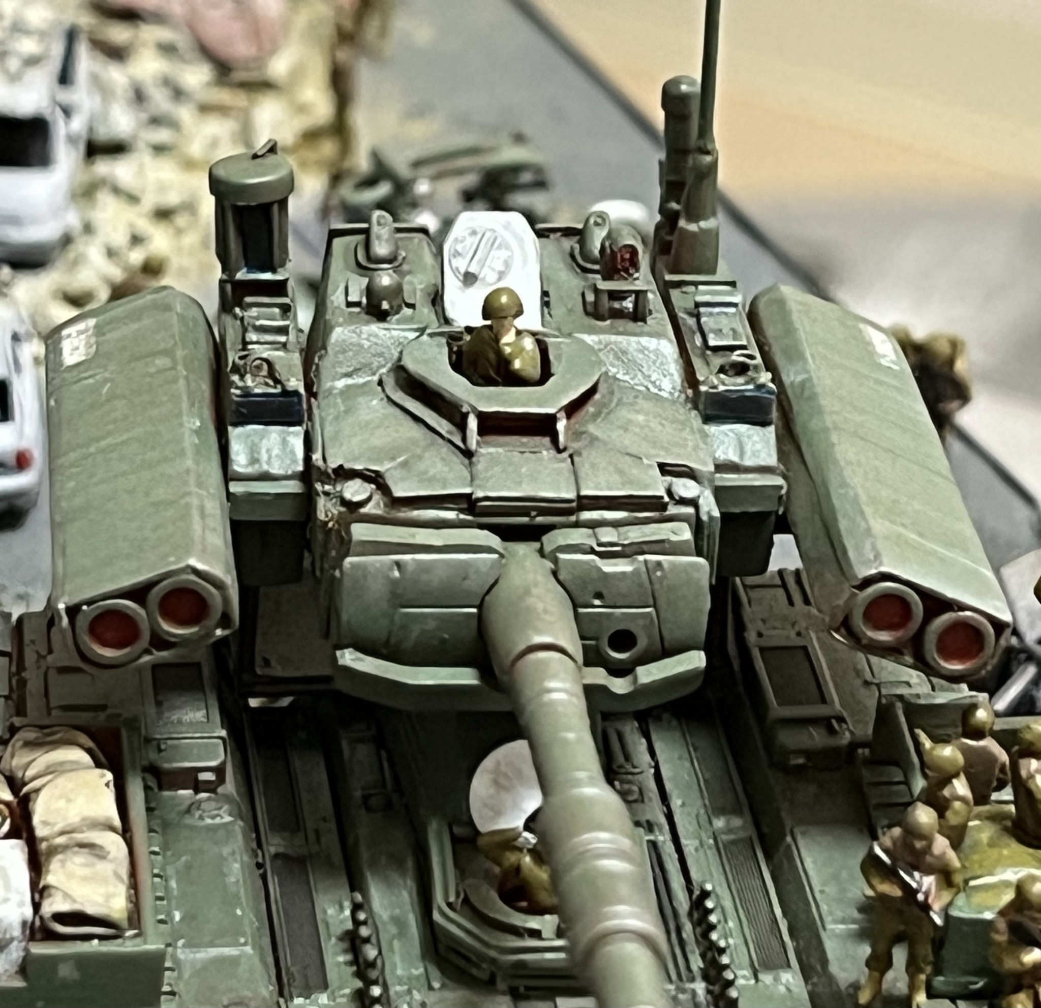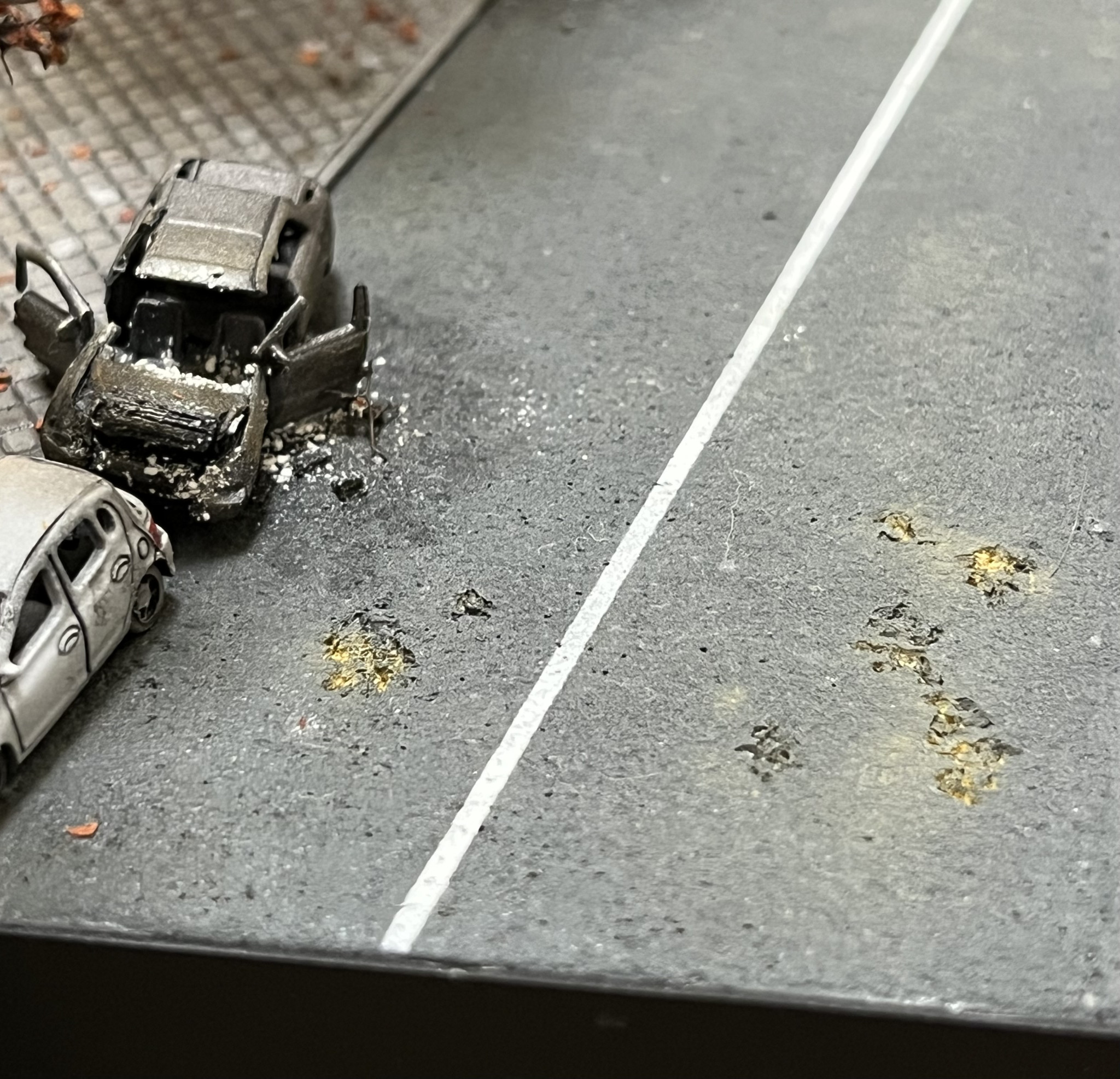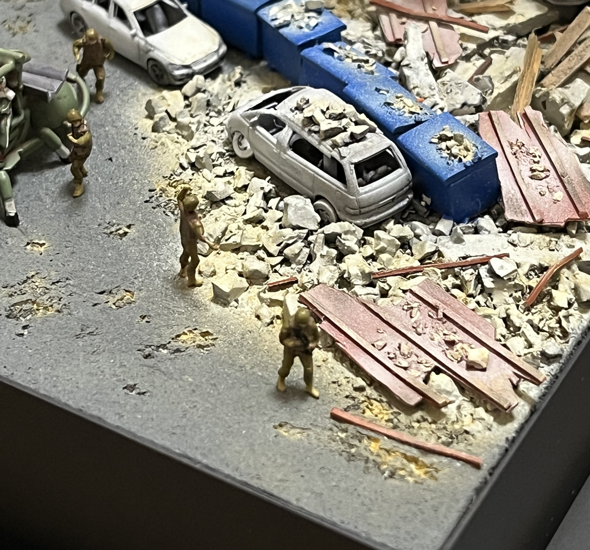 負傷兵フィギュアを追加しました。UMRCのオニー・カスガはいませんが😅よろしければ画面をタップし拡大してご覧に下さい。劇中では死傷者の描写が多くて戦争映画を観ている感じでした。あの悲壮感をガンプラで戦場ジオラマとしてしかも1/144のミニスケールで表現できてたら申し分ないと思ってます。マゼラアタックもウェザリングに手を加えました。雨垂れに埃が付着した感じで全体的に汚してます。アスファルトも少し気に入らなかったので表面をけがいてダメージを加えています。あと心残りとなっているのが建物のウクライナ語の看板です。ロケハン建物写真の正面エントランス上とオーニングテント上に取り付けられている物です(テント上のアルファベットは全く読み取れません😅)。何度となく挑戦してますがアルファベットをうまく切り抜けず挫折を繰り返してます。ミリタリースケールのジオラマだと建物の看板とか結構リアリティ出せる要素だったりするんですけど、デザインカッターで切り抜くにも1/44のサイズは小さ過ぎます😭まだ時間ありますから引き続き頑張ろうと思います。