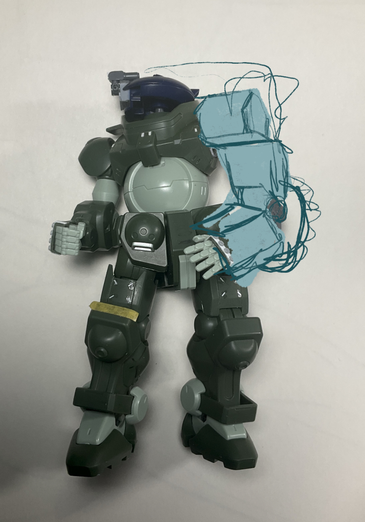 I had an idea early on that one arm should be an oversized arm designed to operate heavy equipment. I do quick and rough sketches like this all the time, they don’t have to be very exact, just a general idea of how it will look. That way I can still make spontaneous decisions when kitbashing, while still following a loose guide.