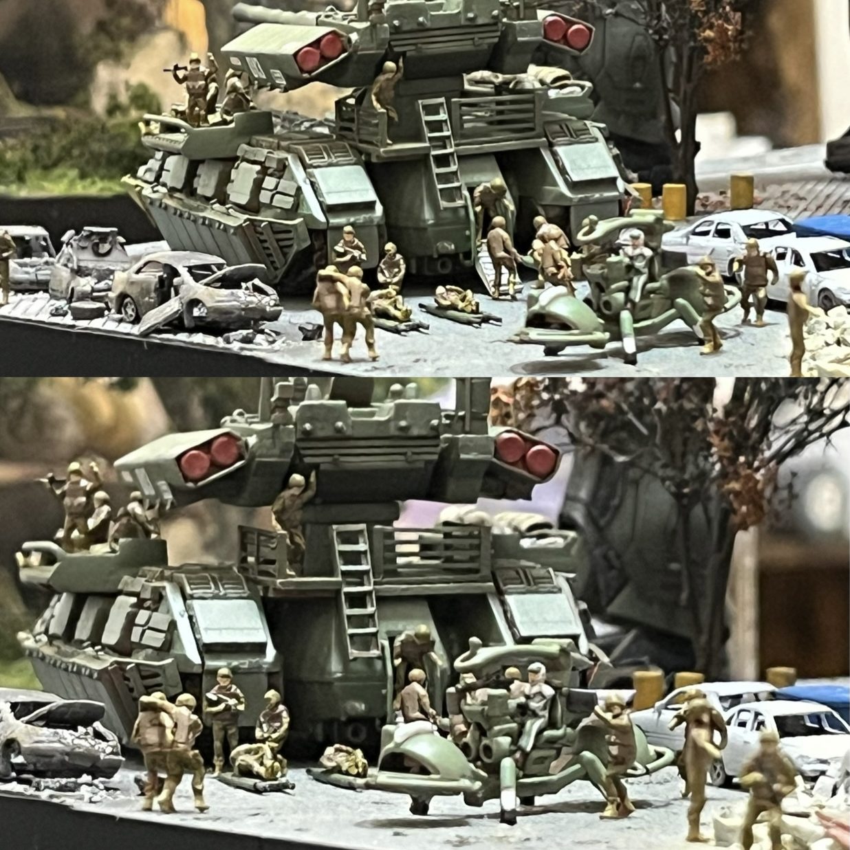 RaMuShizu 2025.10/29更新 手直し中… 56 22 いいねしたモデラー(22) 0 作品を共有 フィギュア4体増やしてかなり混沌とした感じになりました😅この4体がまた良い演技をしてくれています。どの4体か?分かった方…いつもありがとうございます!このアングルも良い感じです。「撤退!撤退!」「敗走!敗走!」って感じですね…これでも1/144なんです。ベルゲガンタンクの時もそうでしたがこの人達が主役ですね😅模コンですがエントリーできる写真が3枚までなので、どの写真にすべきか?本当に迷います😭テスト撮影を重ねる度に迷宮を彷徨います。 制作中 コメント コメントをして応援しよう コメントにはログインが必要です RaMuShizu ガンダムは一年戦争以外はあまり知らないオッサンです。1年戦争以外のMSは殆ど知らないので話しについて行けない事もしばしば😅。1年戦争🪖をミリタリー的にあしらった物が見るのも作るのも好きです。ミキシングとやらはやった事もなくパテやプラ板を使った古風な改造しかできません。模活の年季は入ってますのでそれなりに見応えのある作品を心掛けて作って行きたいと思います。 6 「BATTLE OF CALIFORNIA BASE」その後 前作のキャルフォルニア基地で連邦守備隊が壊滅した後の状況です… 6 EXマゼラン&サラミス ソロモン攻略に向けティアンム艦隊と合流すべくルナツーから出撃… 9 「3部作最終回」 なんとか間に合いましたね。 2 「やべえ、遅刻だ!」 かなり慌ててますね。 RaMuShizuさんのページ