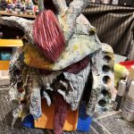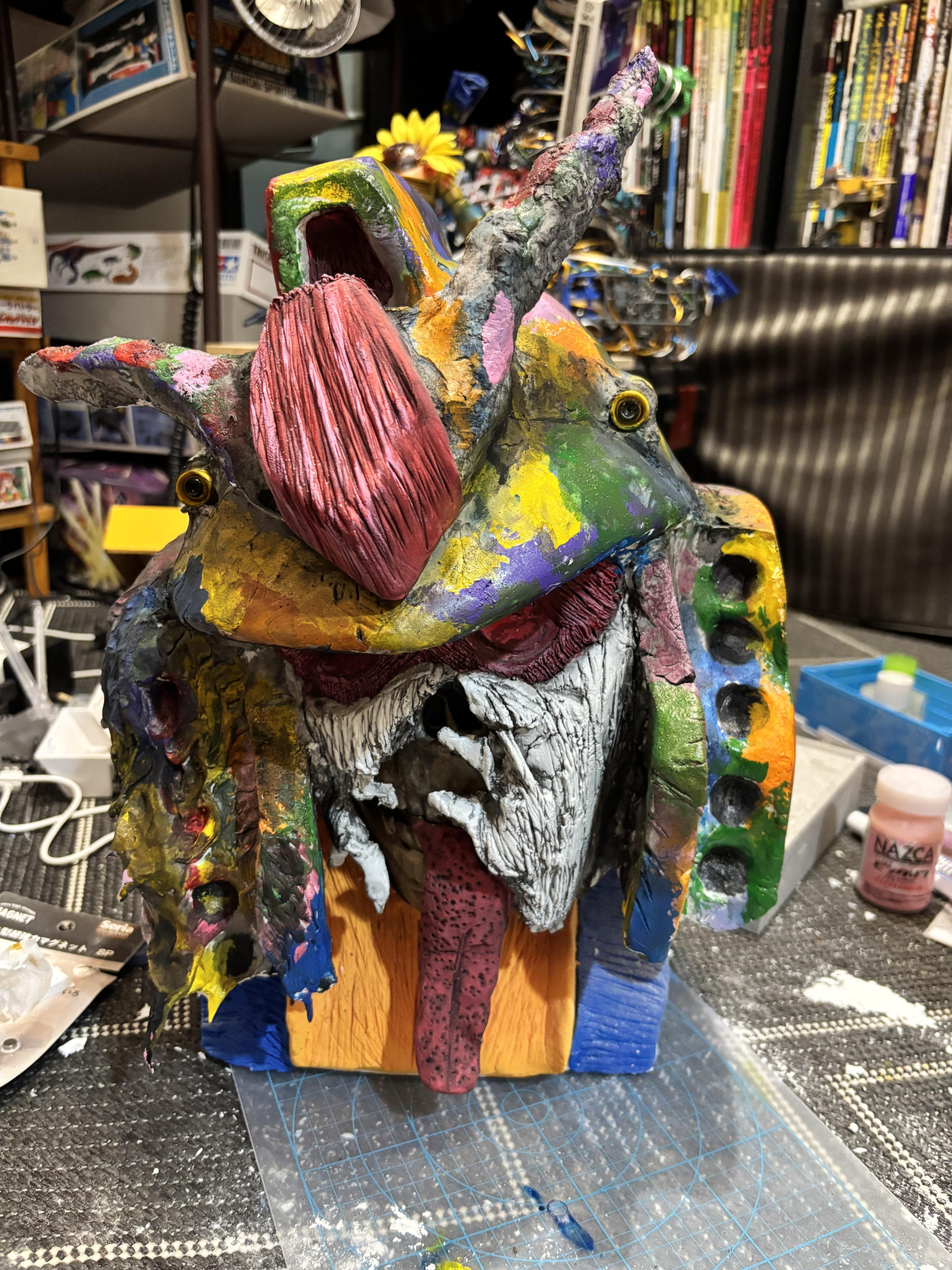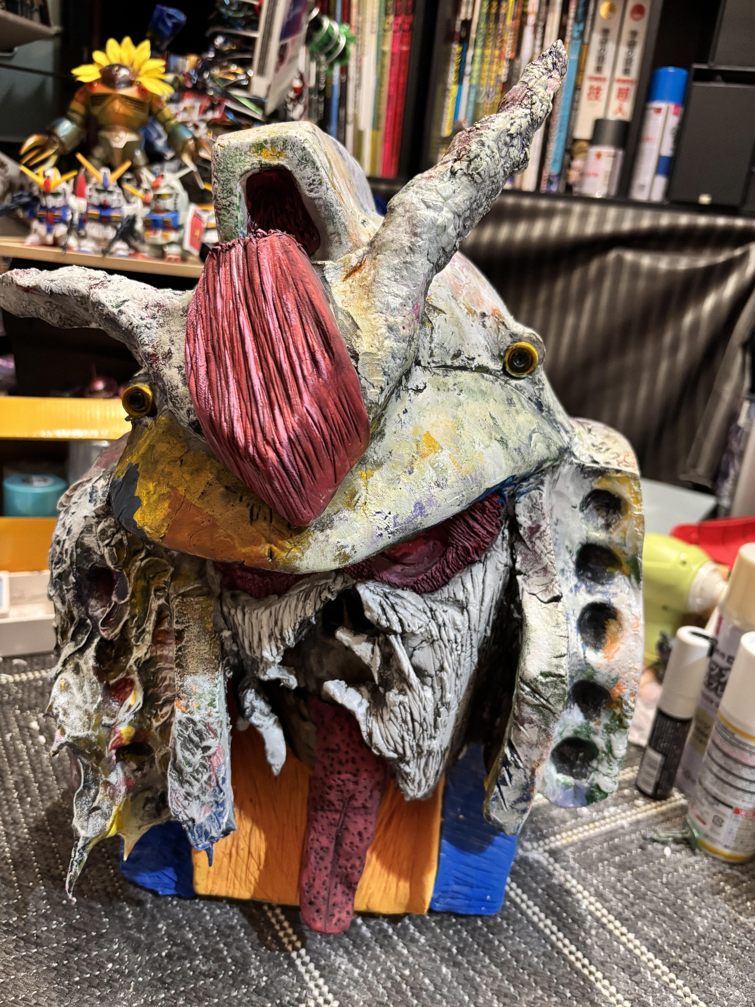 PTSDになったジオン兵の見るトラウマのイメージで作ってました👿統合失調症の人の自画像や戦争を描いた絵なども参考イメージです。今回は展示スペースの関係でできなかったんですが、ガンダムの前に立ち尽くすジオン兵を置いて完成にしたいなと!