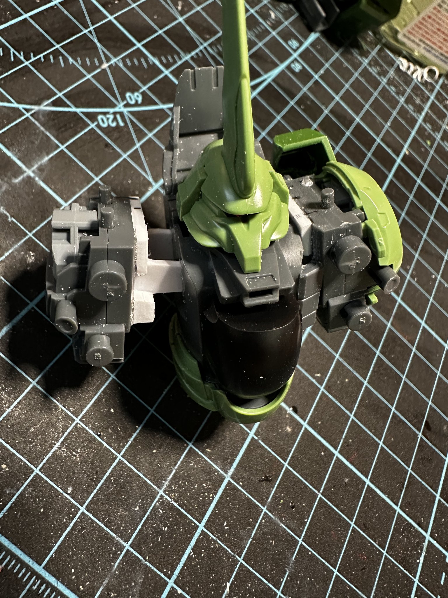筋彫りと塗装の修行のつもりがやっぱり普通に作れず。ってかくそ重バインダーを支える割にはフレームが軟すぎて仮組み外すタイミングで破損、プロポーション修正ついでに1.5mmプラ板でガチガチにしてやった。