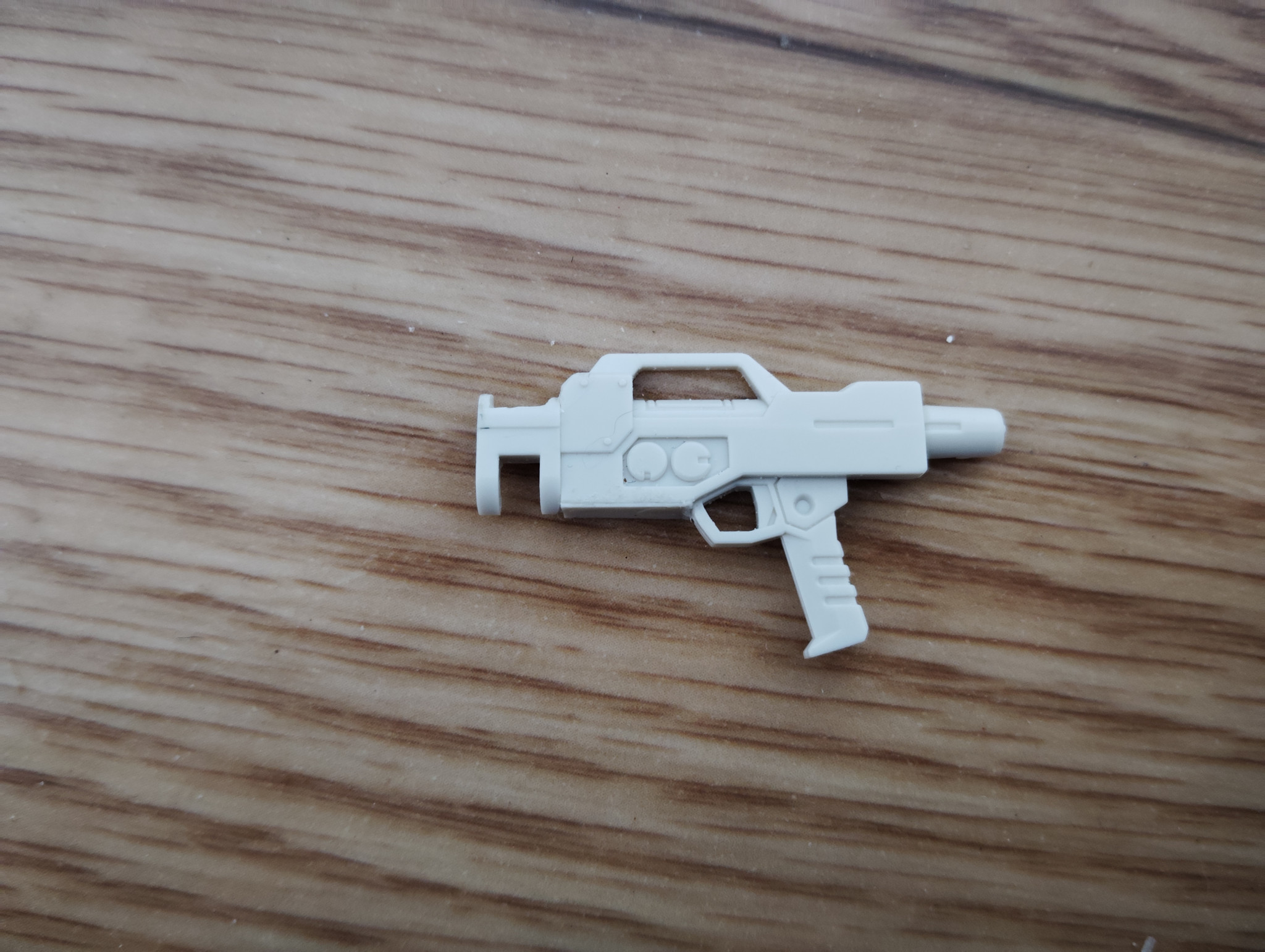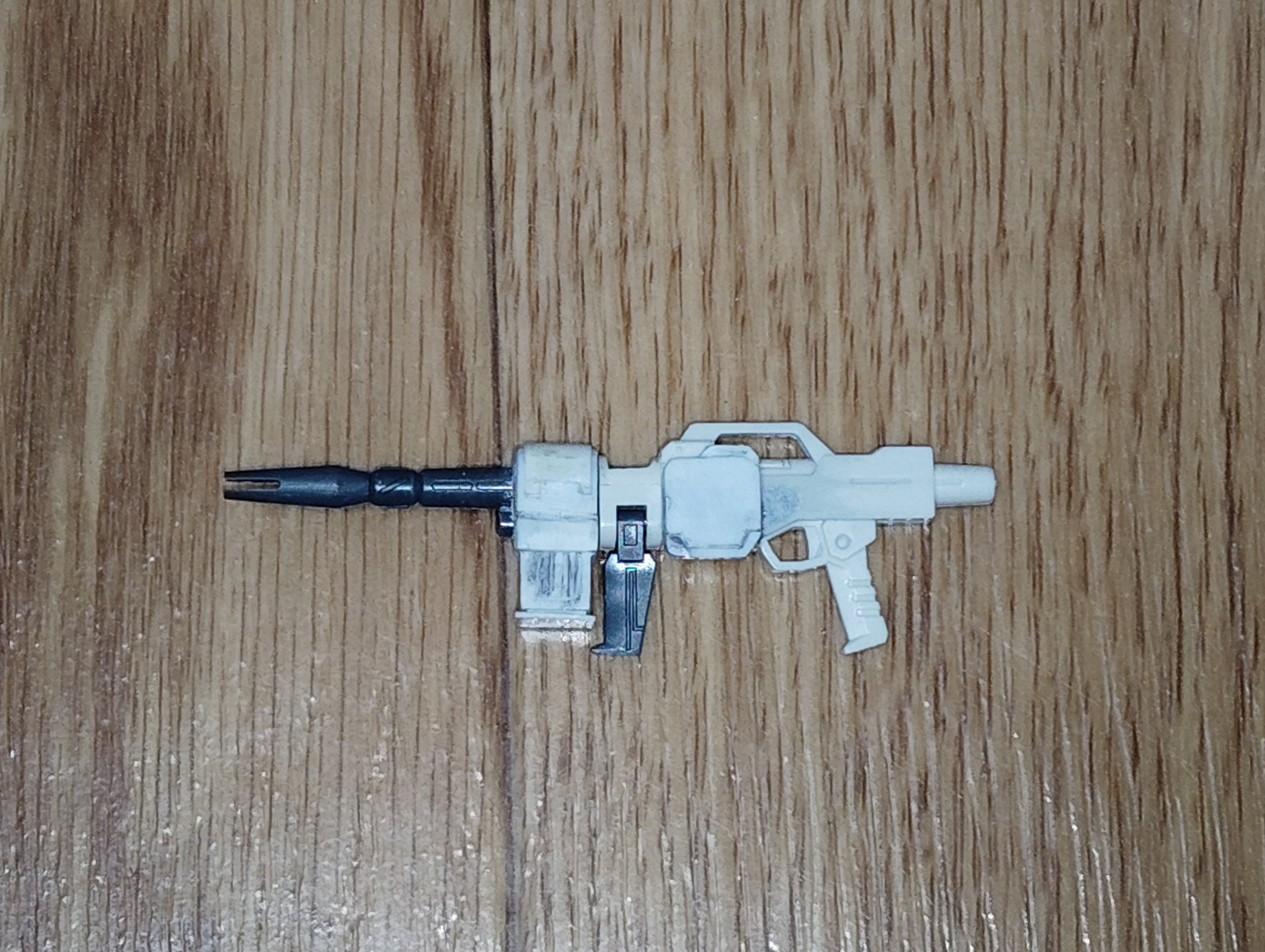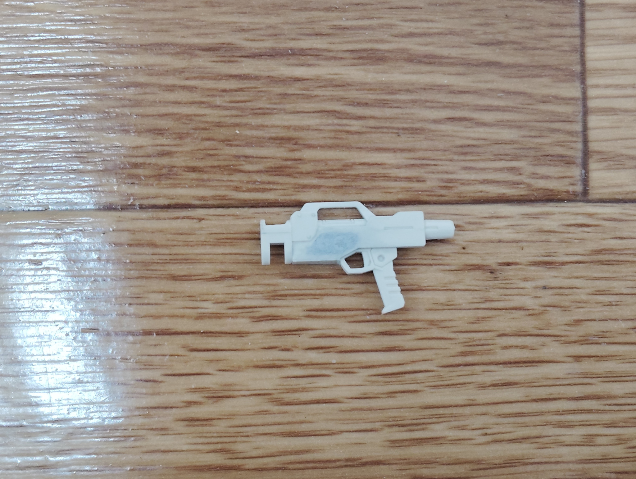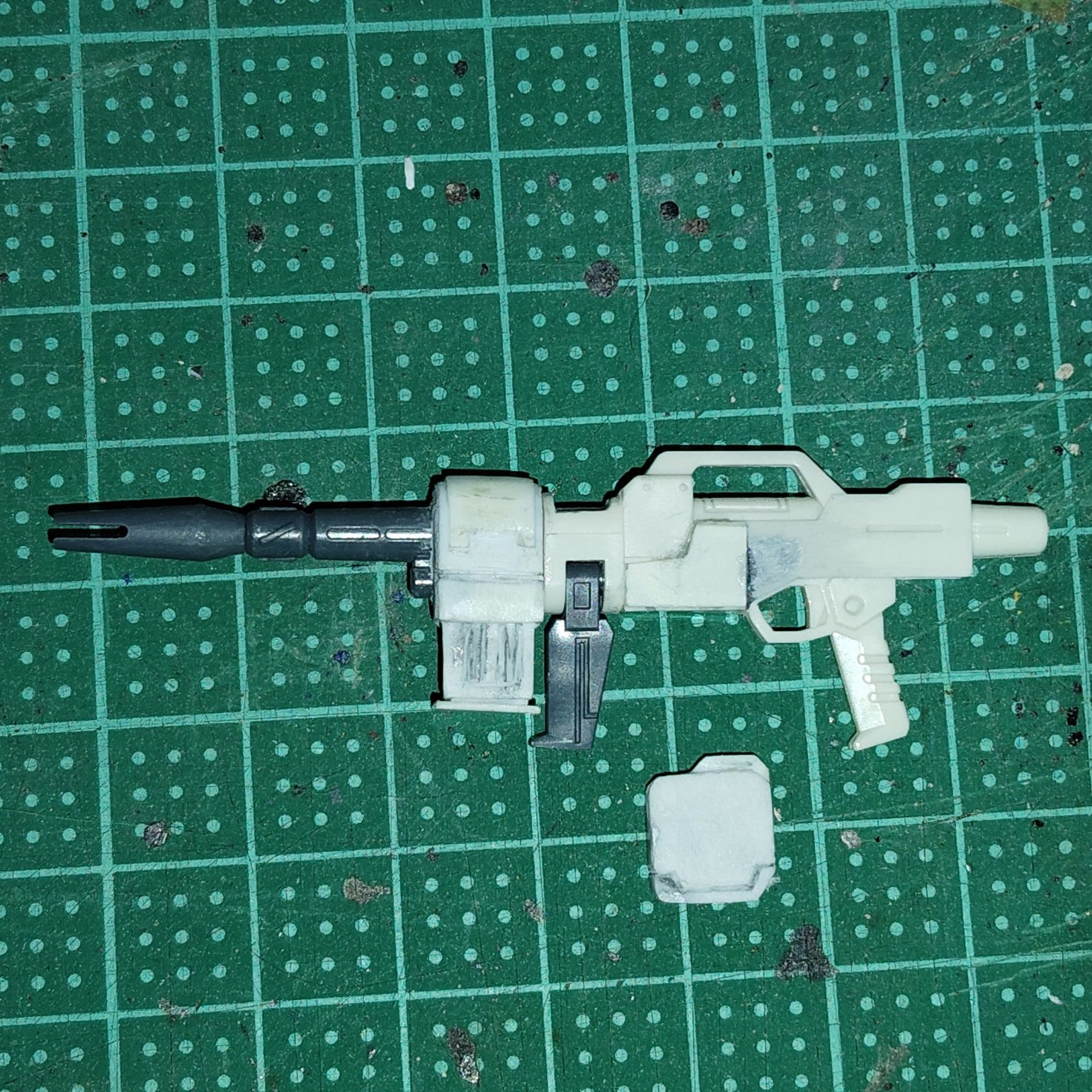 もともと陸戦型ビームライフルの銃身左側にあったディテールをパテで埋め、ヤスリとサンドペーパーで平坦にしていきます。 これで、銃身右側と同じくシンプルなデザインになりました。