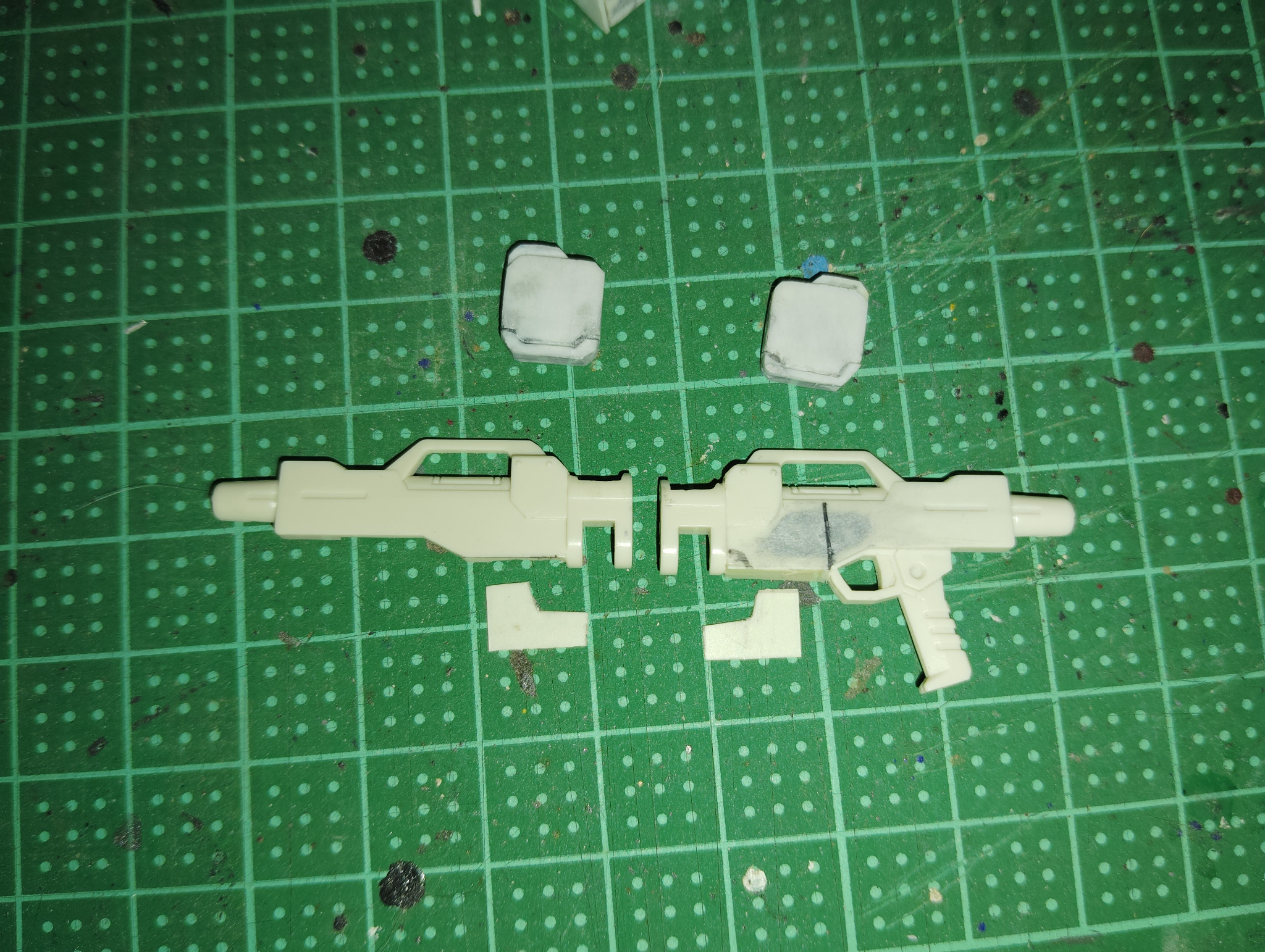 今回は、前回から製作を始めた追加パーツをビームライフルに取り付けるための下準備をもう少し行います。