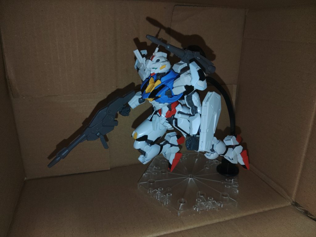 エアリアル自体はほぼそのままで頭にレヴィニクスのヘッドパーツとランナーに針金を接着させたものを装着しています。肩と盾と足の1部はルブリス、バックパックとピストルはレヴィニクス、バックパックの黒い物(見えにくいですね…)は30mmのオプションパーツ、ビームライフルとビームキャノンはハインドリー・シュトルム、太もものビームサーベルはエールストライカーパック?を流用しております。