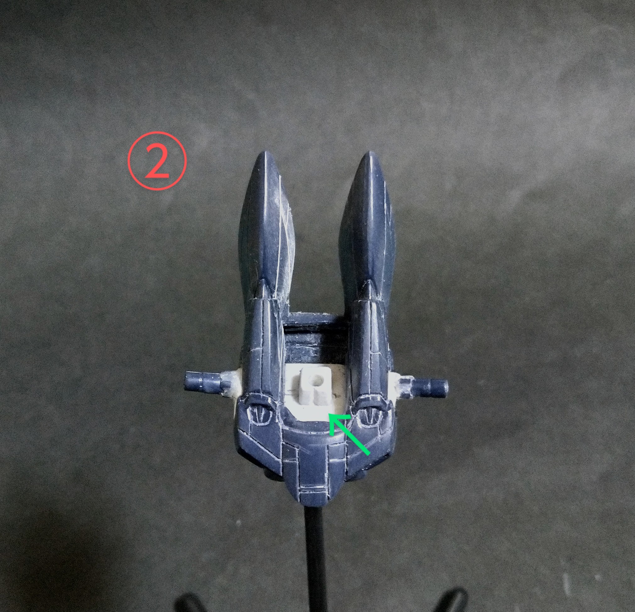 ②緑の矢印のところは首の付け根部を切り取って少し下げた位置にプラ板で床を作り、首のパーツをプラ板で作りました。