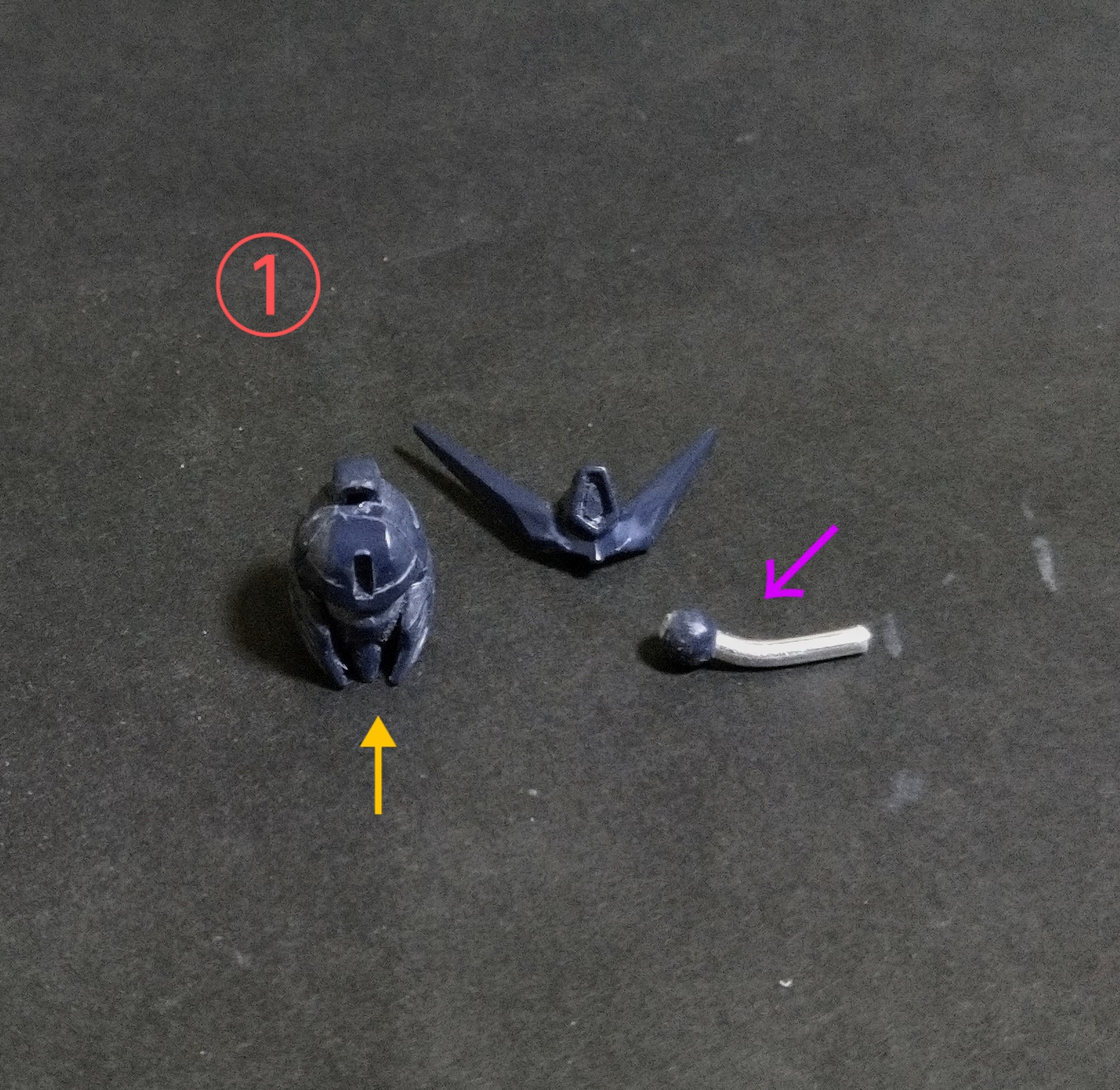 ①元々頭部の出来は良いので黄色の矢印のように軽く削って少し小顔化して、紫の矢印のキットの首のボールジョイントにアルミ線を付けて可動化に。