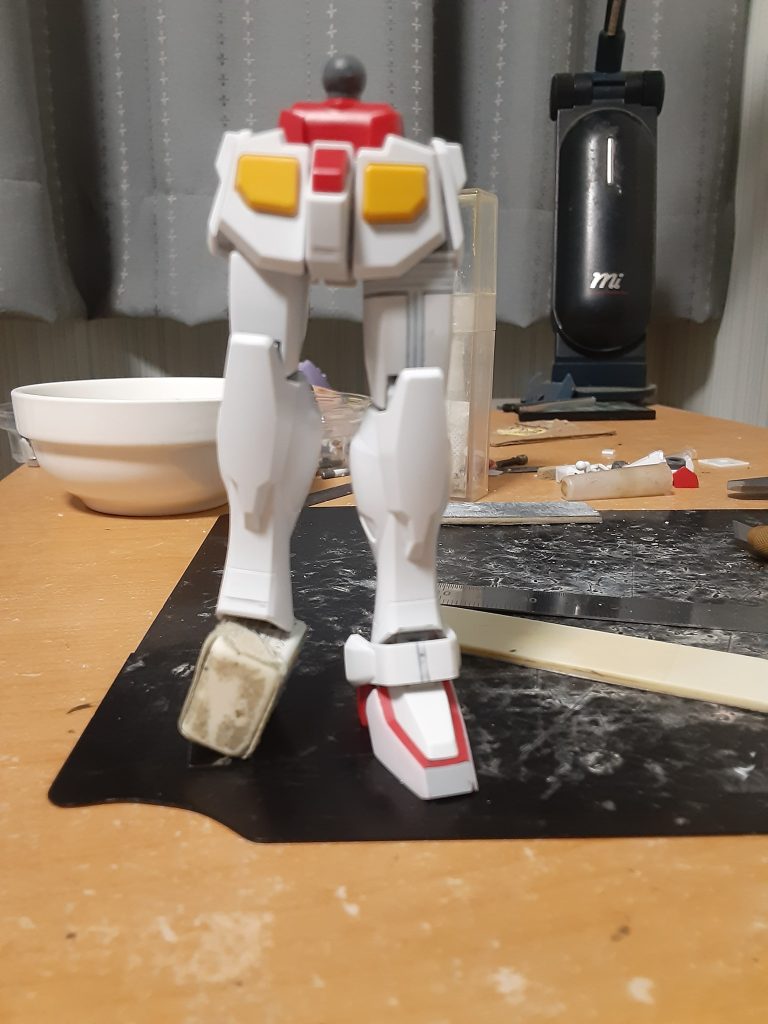 膝関節上部に付いている白い物は、腿の幅増しで空いた分の隙間を埋めるためのプラ板。こういう平面上に薄い板が一段被さったようなデザインが好きなもので。膝を曲げる時にふくらはぎに干渉しないギリギリのラインを狙った位置に貼っています。