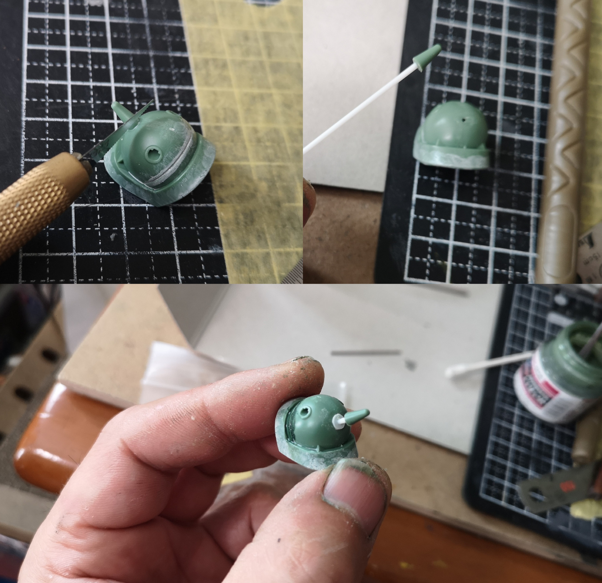 スパイクアーマーは1か所一体成型になっているので、一旦切り離す。裏に肉抜きがあるので、そこをガイドに1㎜プラ棒で軸を作る。