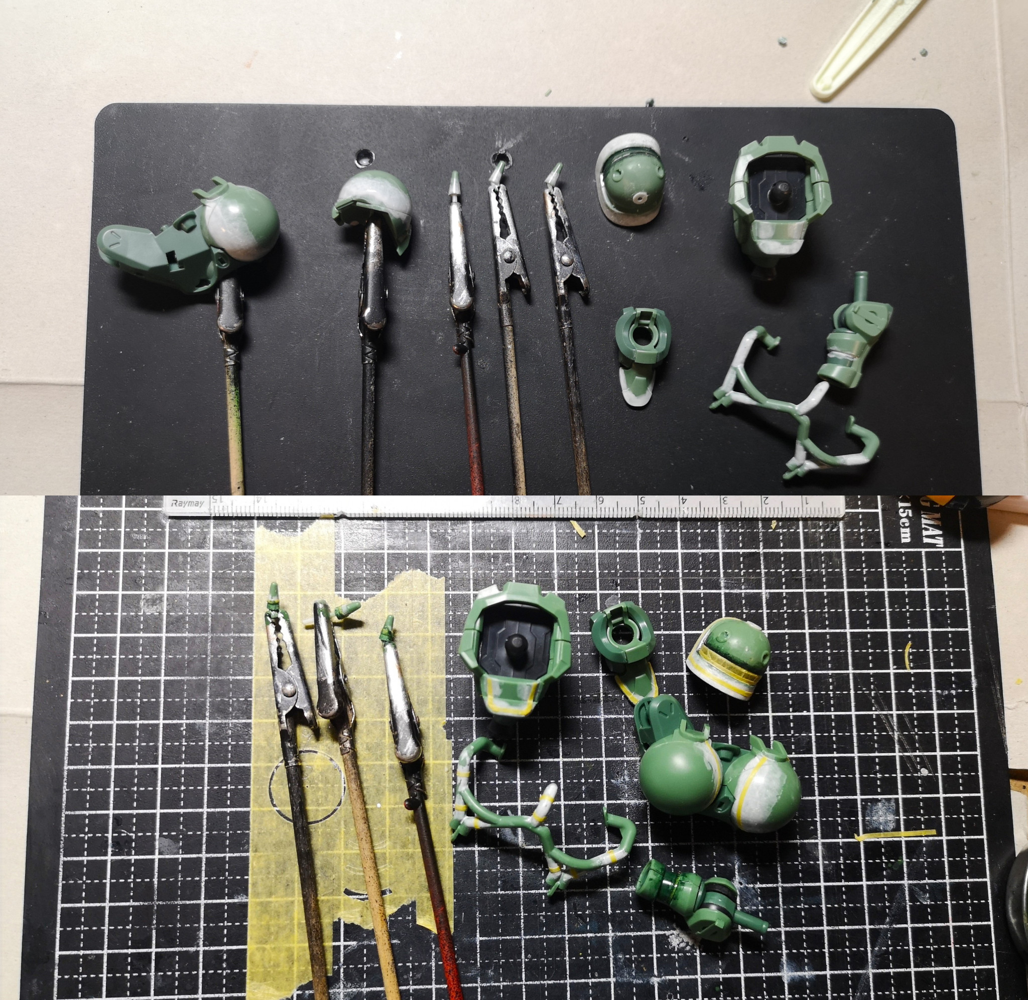 塗分けはラインが入りそうな所に白or黄色を塗っておく、肩のグリーンも。細切り(今回は1mm)のマステを貼っていく。曲線は自分の直感を信じて・・・