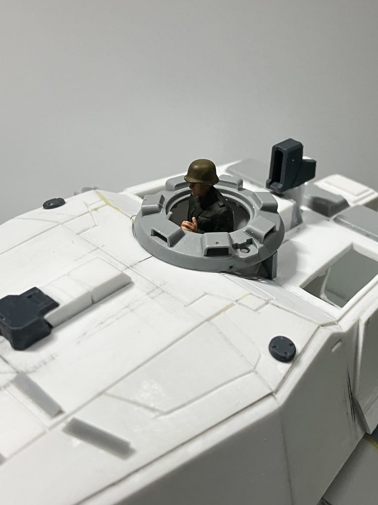 砲塔のディテールアップを始めてハッチを取り付けて兵士を乗せてみたら、イスが無い状態で肩の辺りまできてしまい例えイスの上に乗っても高さが高いため砲塔の高さを低くして行きます