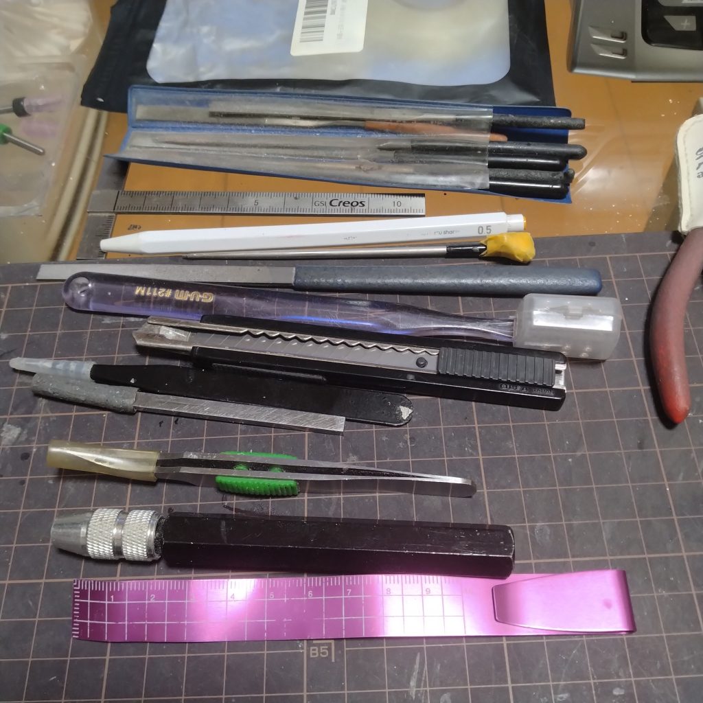 皆さんの道具って興味深いです。自分はいつも良き道具をば揃えようと思うんですけど、結局、主として100均のハサミ、デザインナイフ、棒ヤスリ、なんちゃってピンバイスの4種でやっちゃってます(;´Д`)