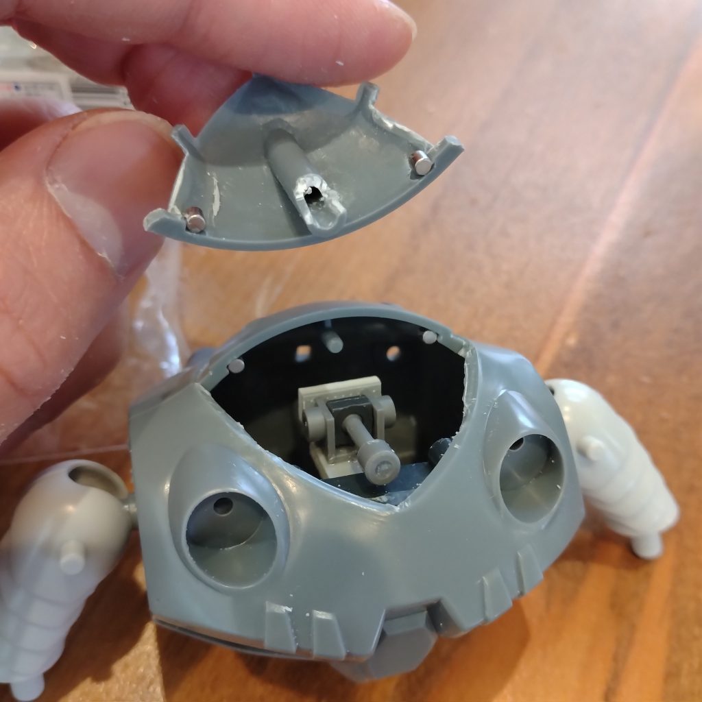 下部に剥離剤つけて上部の柱部分にパテつけて、下部に押し付け。硬化したら剥がして整形で、合わせ目完全ではないけど、かなり誤魔化せないかなぁっていつも思って剥離剤買ってなくてやってないマン(zaku-kao5)