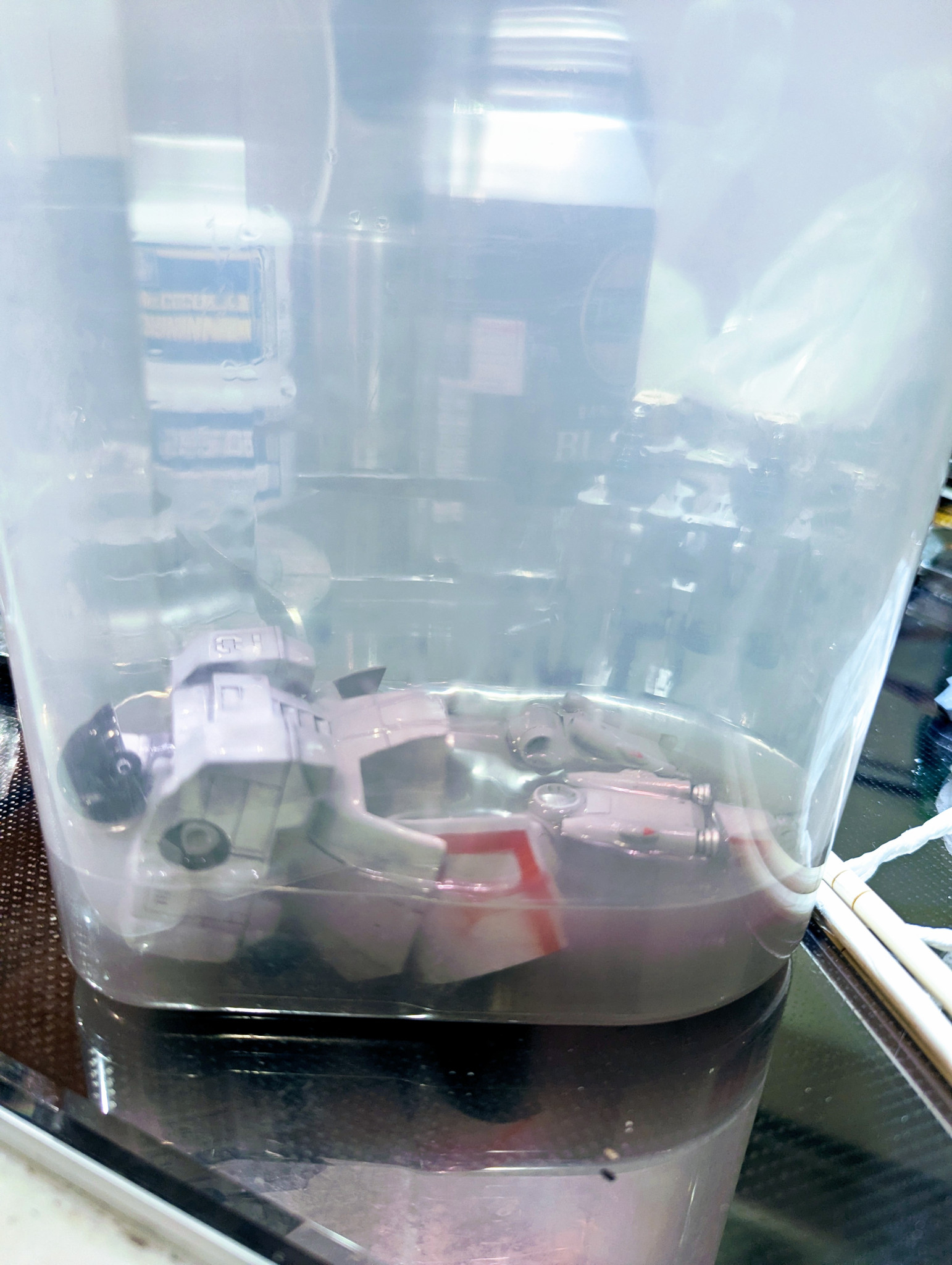 2.アクリル溶剤をキットが浸かるまで注ぎます🐈️麦茶ボトルのいいところは密閉できる蓋です。そのままだと強烈な匂いを発します💫