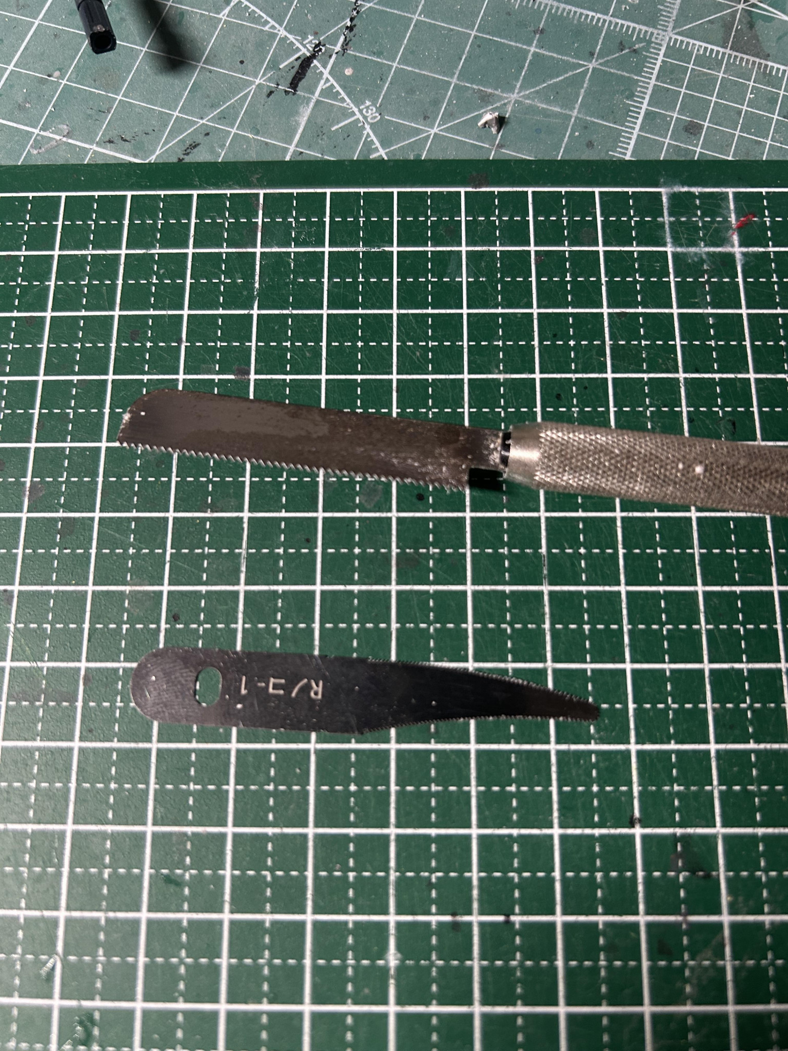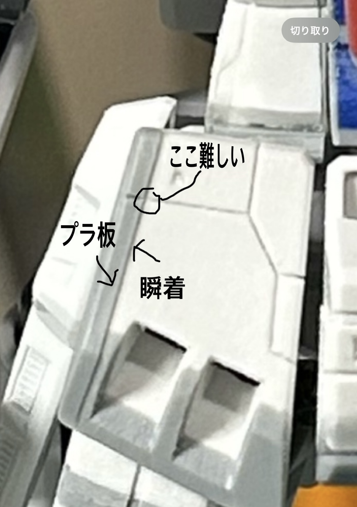 瞬間接着剤は時短でヒケも出来にくい反面、延長箇所を跨いだスジ彫りなんかは非常に難しいです。プラ板と瞬着の硬さが違うのでどうしても瞬着の箇所でタガネが引っかかったりしてプラ板と同じように彫るのが難しいのです😓あとヤスリがけも硬いからちょっと面倒です。