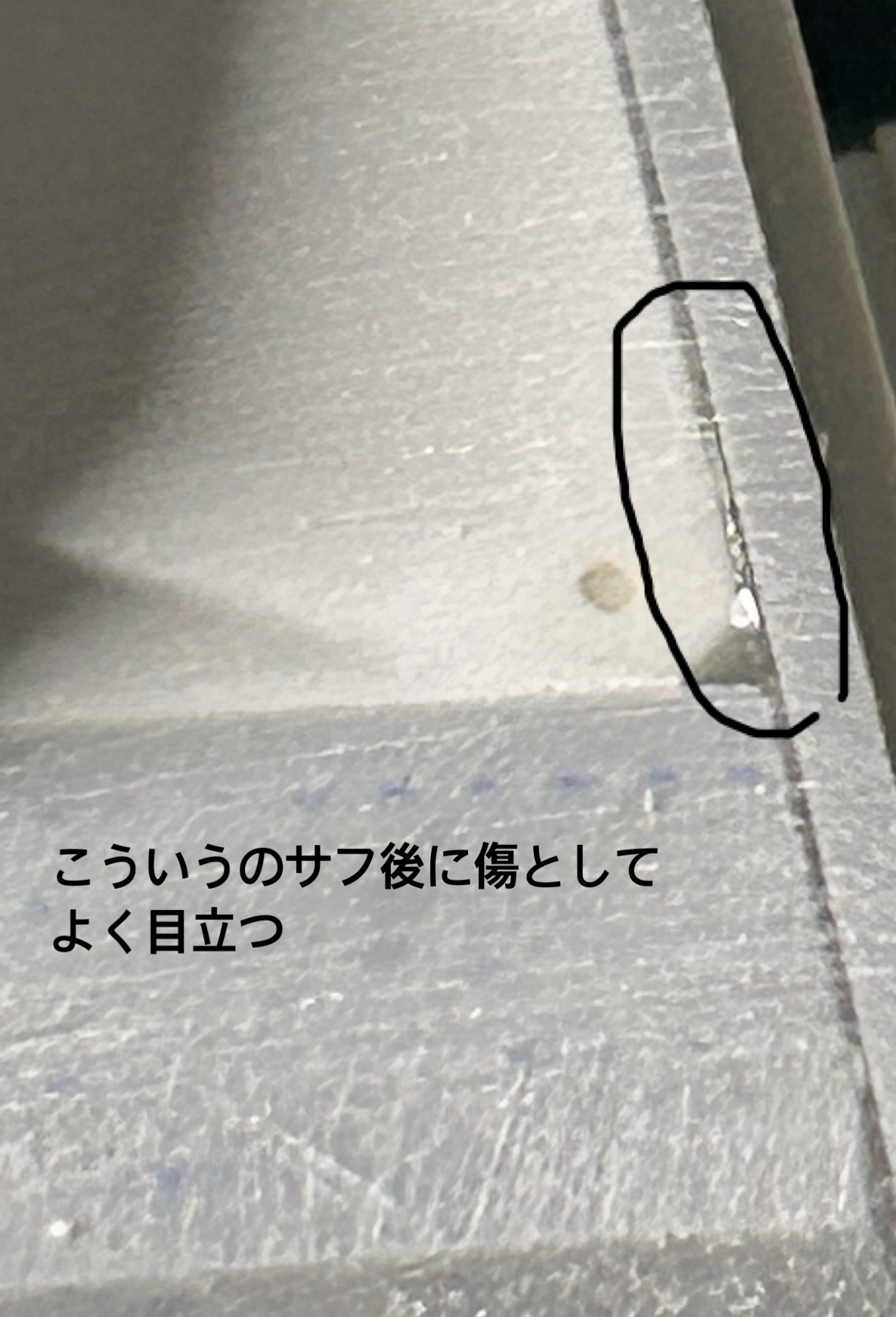 一方で普通のプラ用接着剤は溶かして接着するので、そう言ったスジ彫りなんかでの相性は良い反面、しっかり時間をかけて乾燥させないとヒケが出てしまいます。まぁ基本というか当たり前の事ですが、接着して1〜2日程度でヤスって製面すると確実にヒケがでます。せっかちな私はよくやらかします。笑