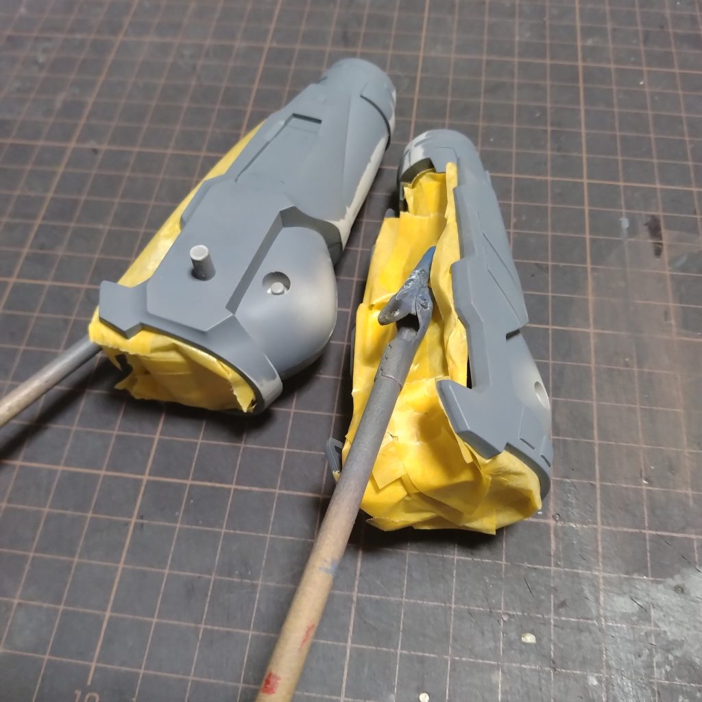 昨日から塗装開始するつもりでしたが!なにぶん長時間作業になるので!体調を整える為にガッツリ睡眠取ってしまいました!😄やはり最後の最後まで面倒なのはバインダーです!😅ご覧の通り見てくれて悪いですがマスキング保護だらけです!😄後のパーツたちは全て持ち手に付けて準備万端です!😀久々の復活後のMG!ちょっぴり気合い入ってます!😄😄実はサイサリスをまともに連邦仕様にするのは初めてです!もう何回も作ってるのに!😄色々家の用事ややることやってから、天気が怪しいですが状態見てモチベが上がったら開始しようと思います!😀
